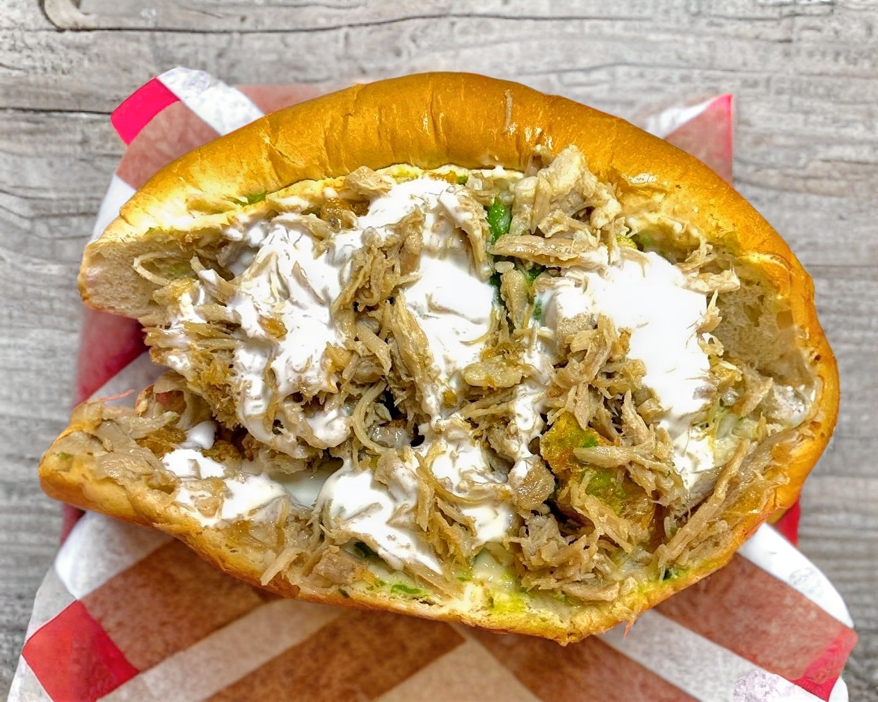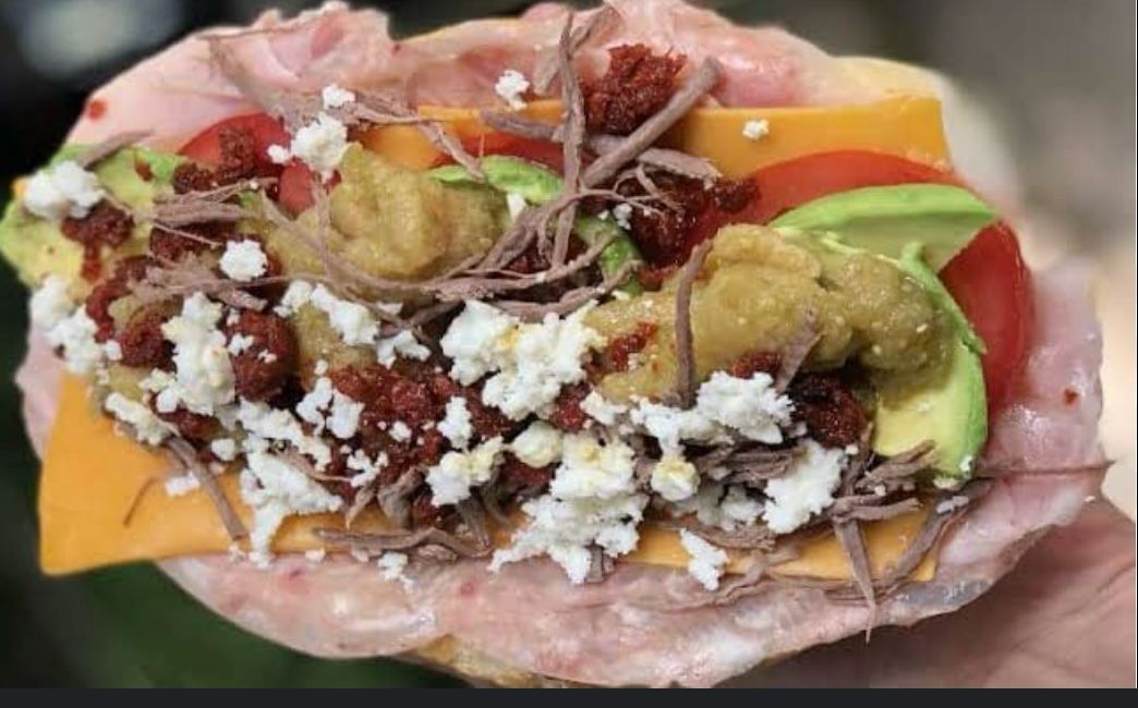 Carne de pierna de cerdo, guisada, mayonesa, tomate, cebolla, chicharrón de cascara, queso blanco, aguacate y crema.