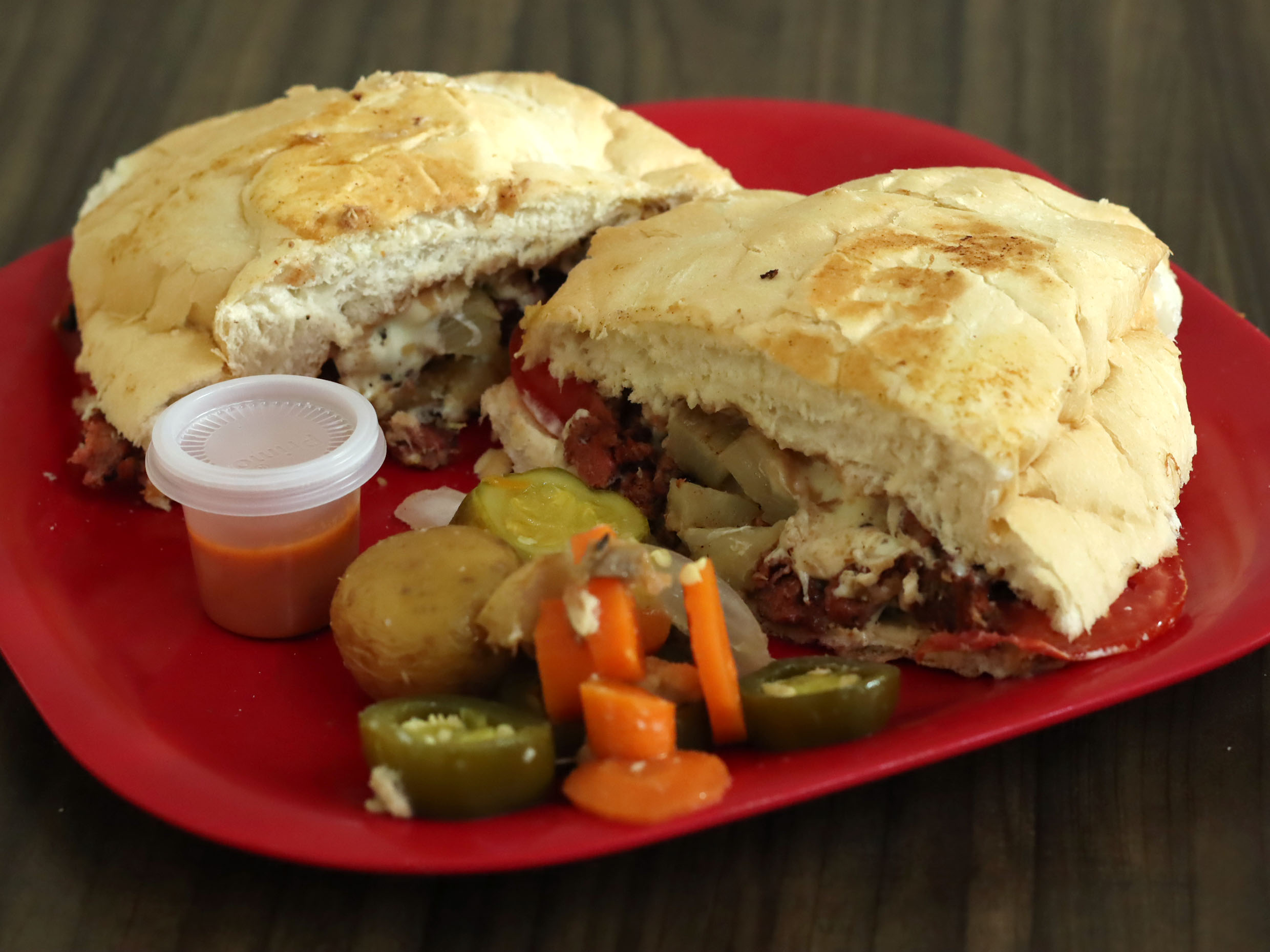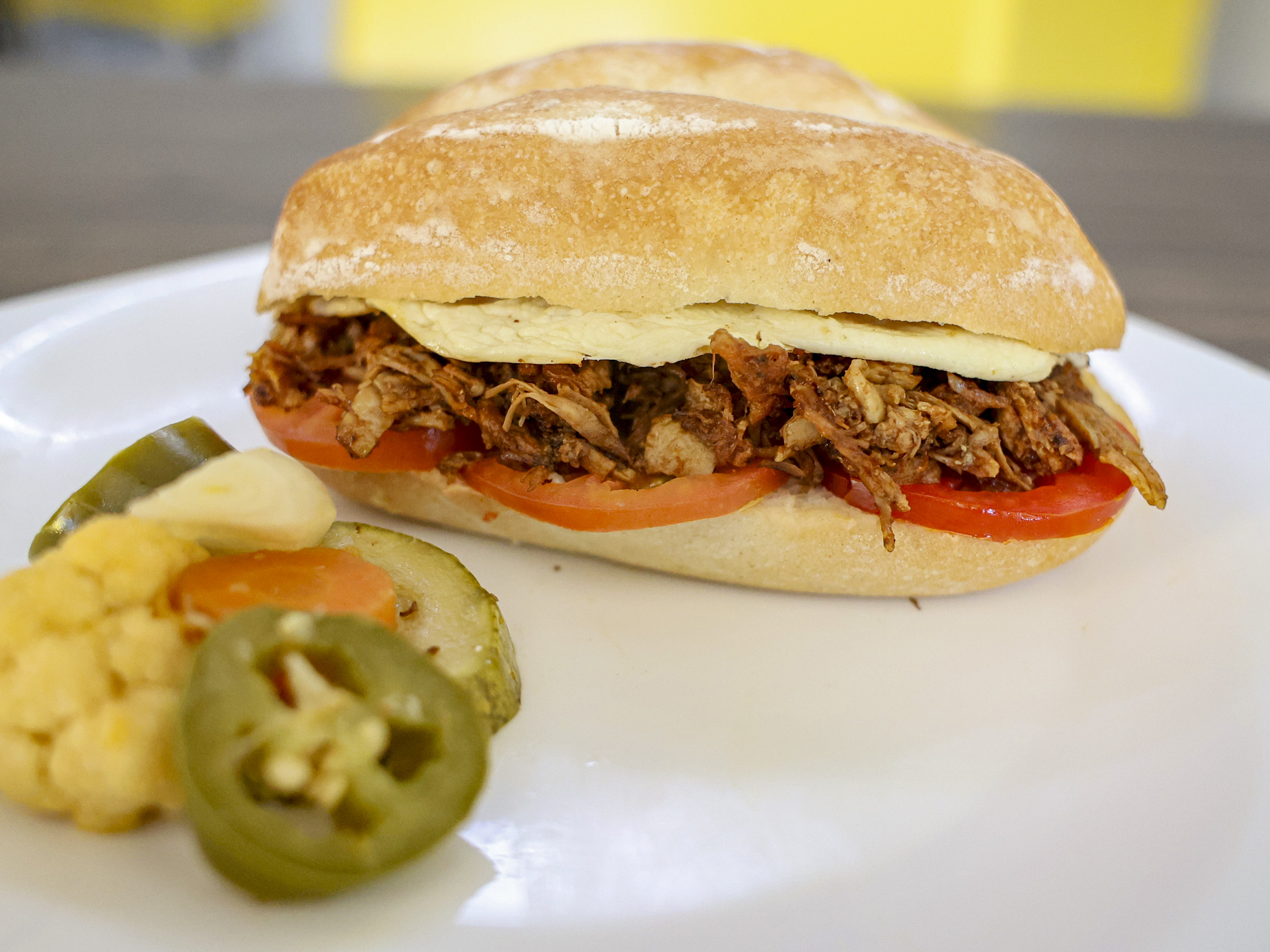Con pierna, jamón y queso Oaxaca. Elaborada con mayonesa, frijoles, aguacate, cebolla y tomate más salsas aparte, picante y chiles en vinagre.