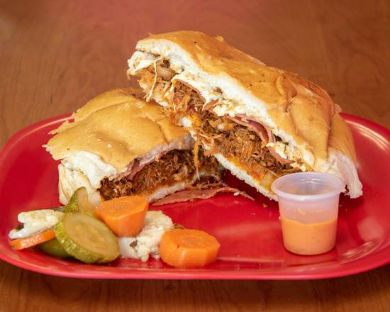 Deliciosa torta, elaborada con queso Oaxaca, pierna, mayonesa, frijoles, aguacate, cebolla y tomate.