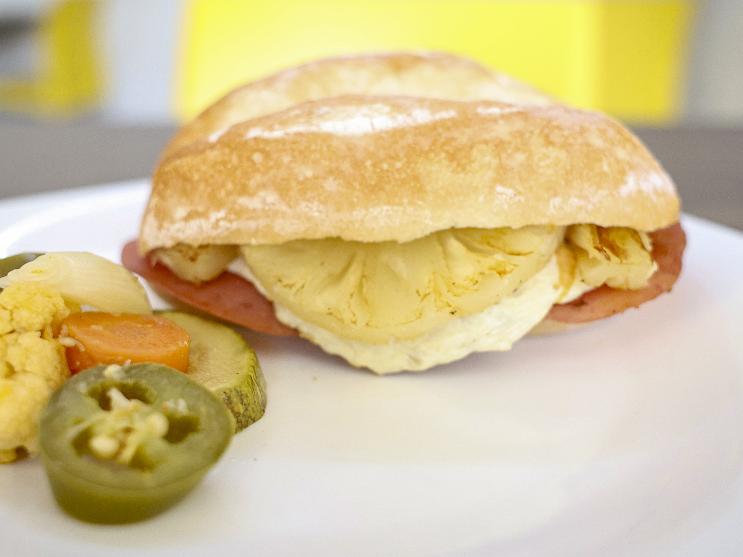 Con jamón, queso, piña. Elaborada con mayonesa, frijoles, aguacate, cebolla y tomate.