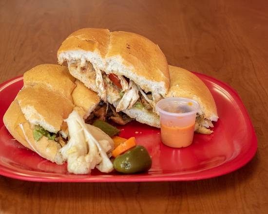 Pollo a la plancha. Elaborada con mayonesa, frijoles, aguacate, cebolla y tomate.