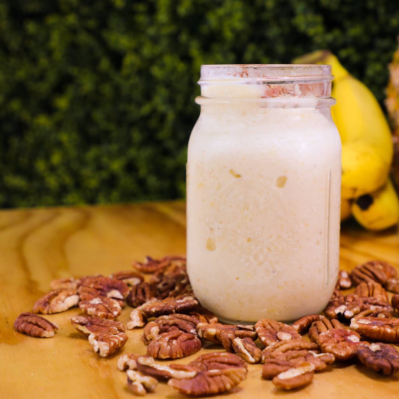 Plátano, piña, yogurt griego sin azúcar, leche deslactosada endulzado con svetia