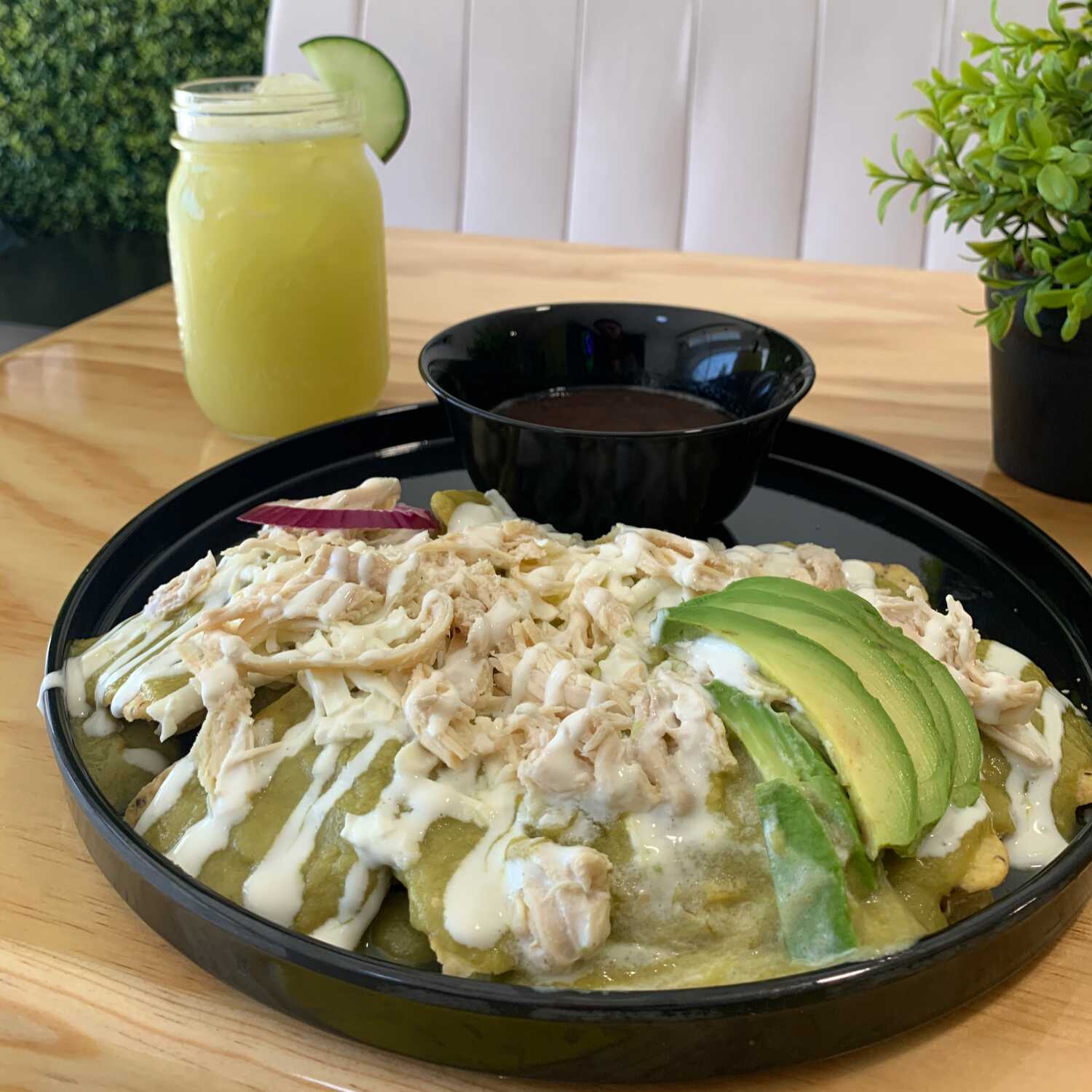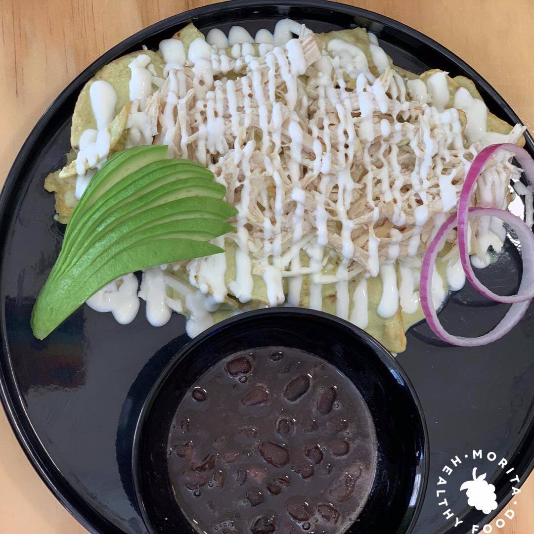 Totopos a elegir en nuestra salsa verde, crema baja en grasa, proteína a elegir , cebolla morada, queso panela, aguacate y frijoles de la olla.
