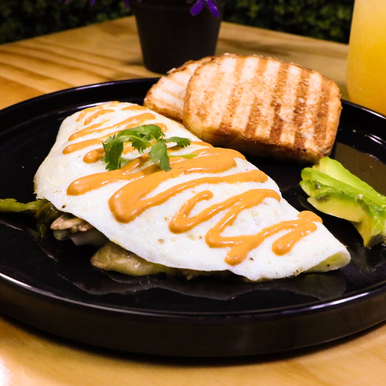 Claras de huevo con relleno a elegir , queso gouda, acompañado con aguacate, pan artesanal y frijoles de la olla.