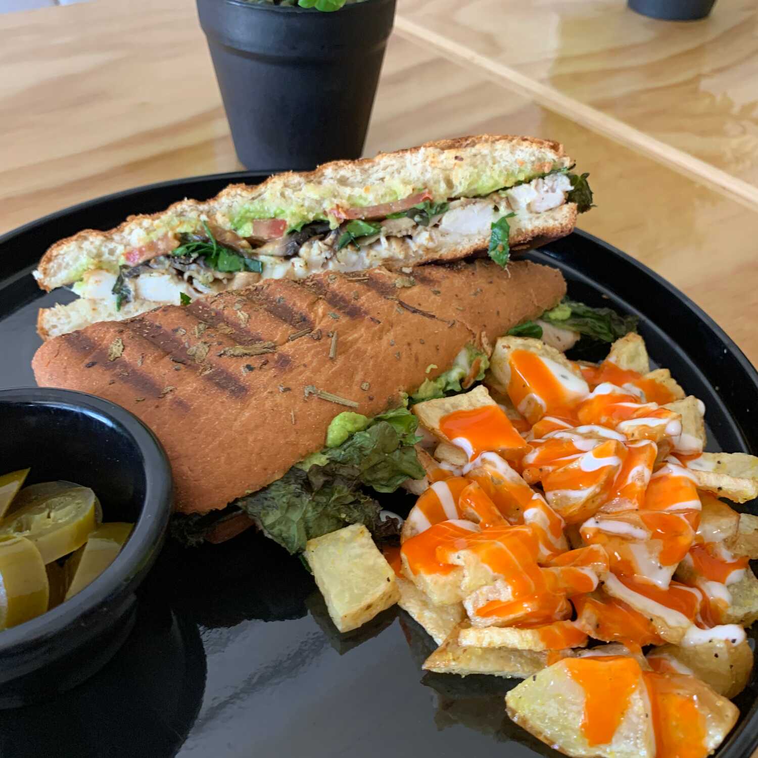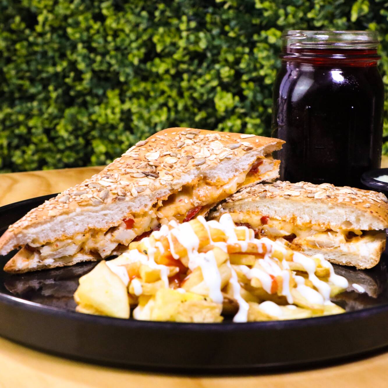 Pechuga de pollo a la plancha, tomate deshidratado, espinacas baby, pimientos, queso mozzarella y aderezo chipotle de la casa en nuestro pan artesanal.