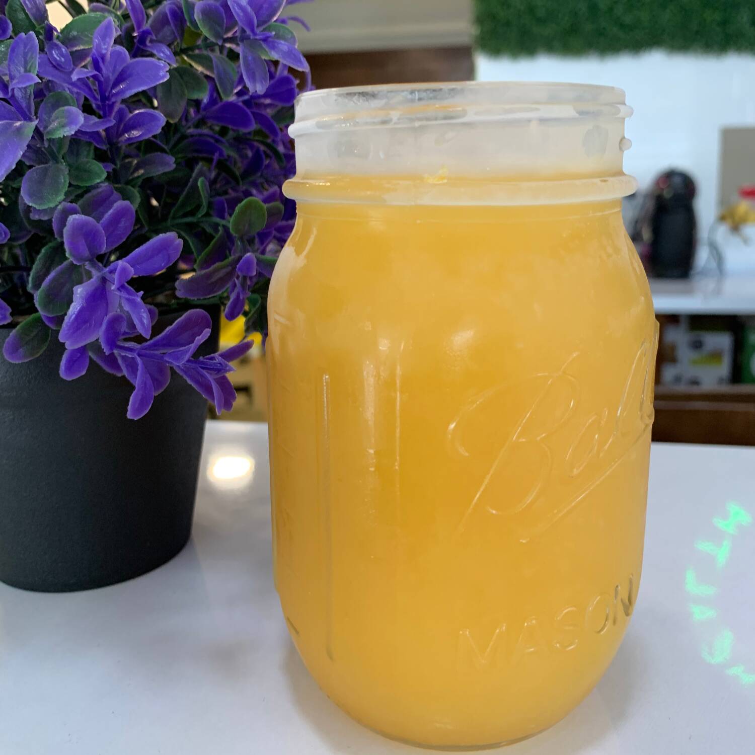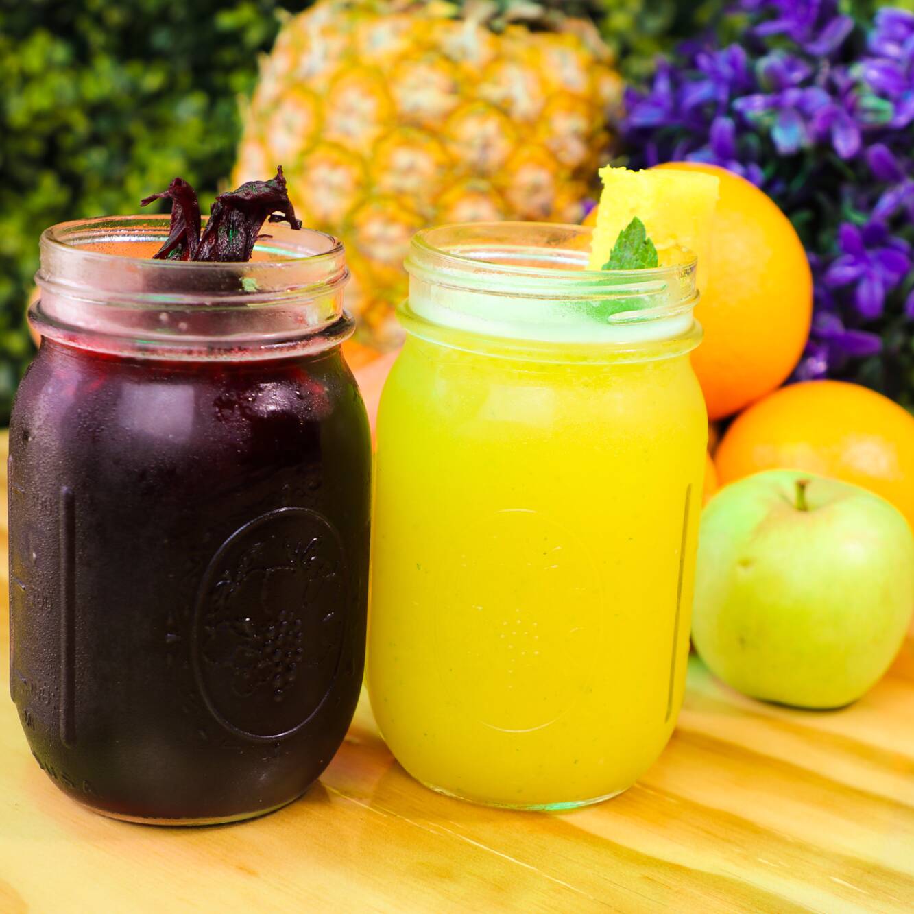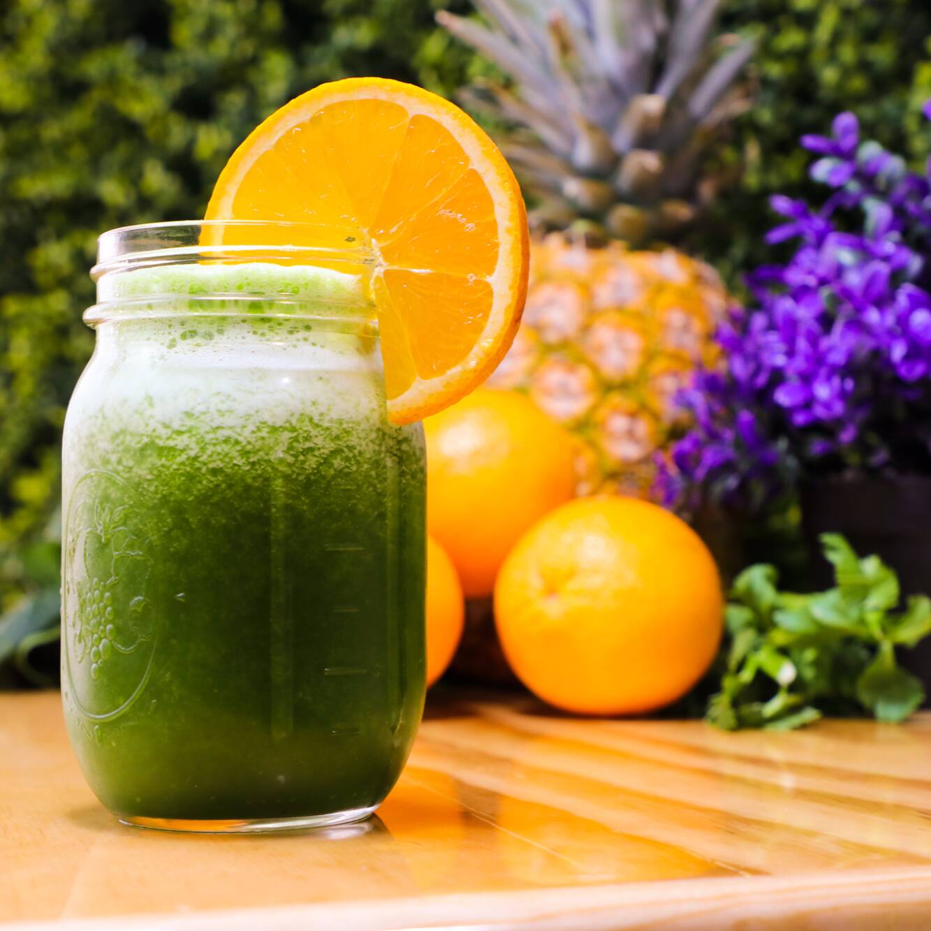 Jugo de naranja, piña, apio, pepino, manzana y espinaca
