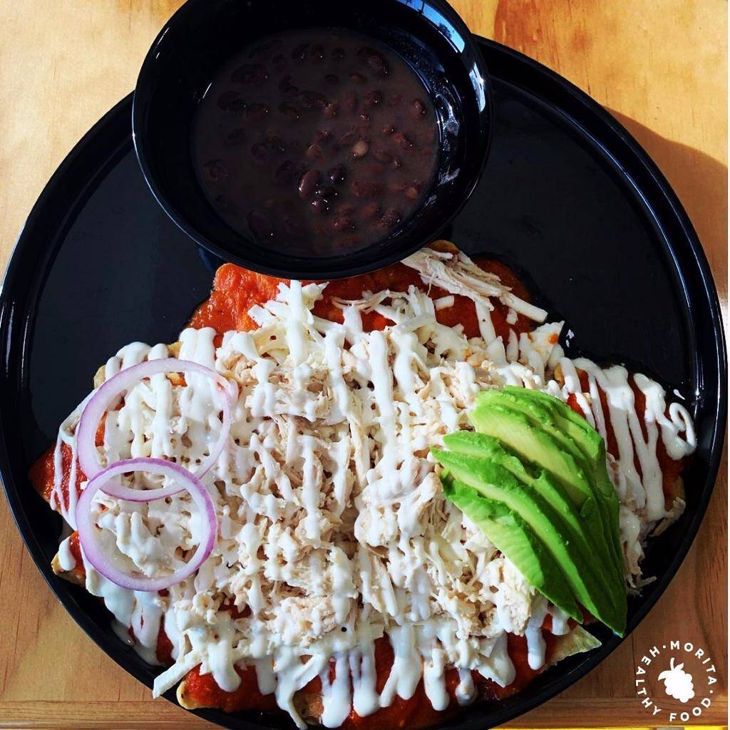 Totopos a elegir, en nuestra salsa roja de la casa, crema baja en grasa, proteína a elegir ,cebolla morada, queso panela, crema baja en grasa, aguacate y frijoles de la olla.