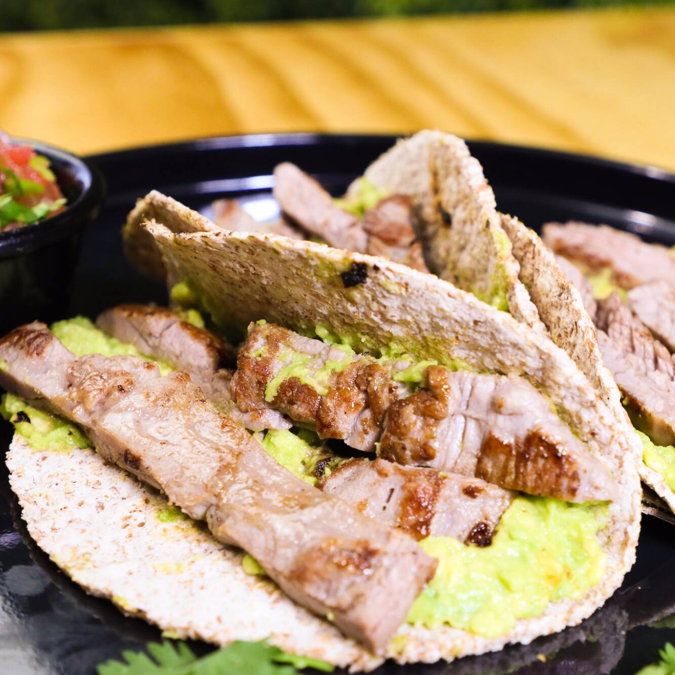 Tres piezas en tortilla tigger, arrachera de res, con aguacate y pico de gallo.