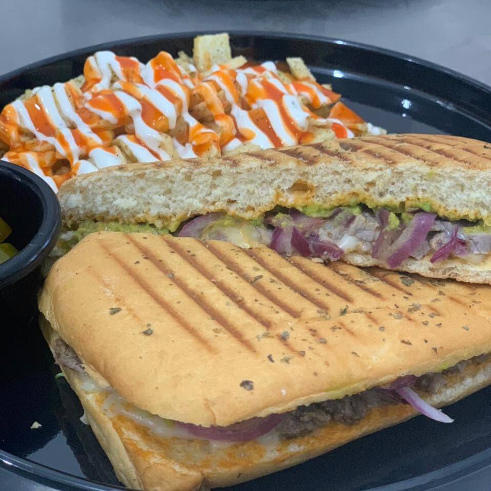 Arrachera de res a la plancha , aguacate, cebolla caramelizada, queso mozzarella y aderezo chipotle de la casa.