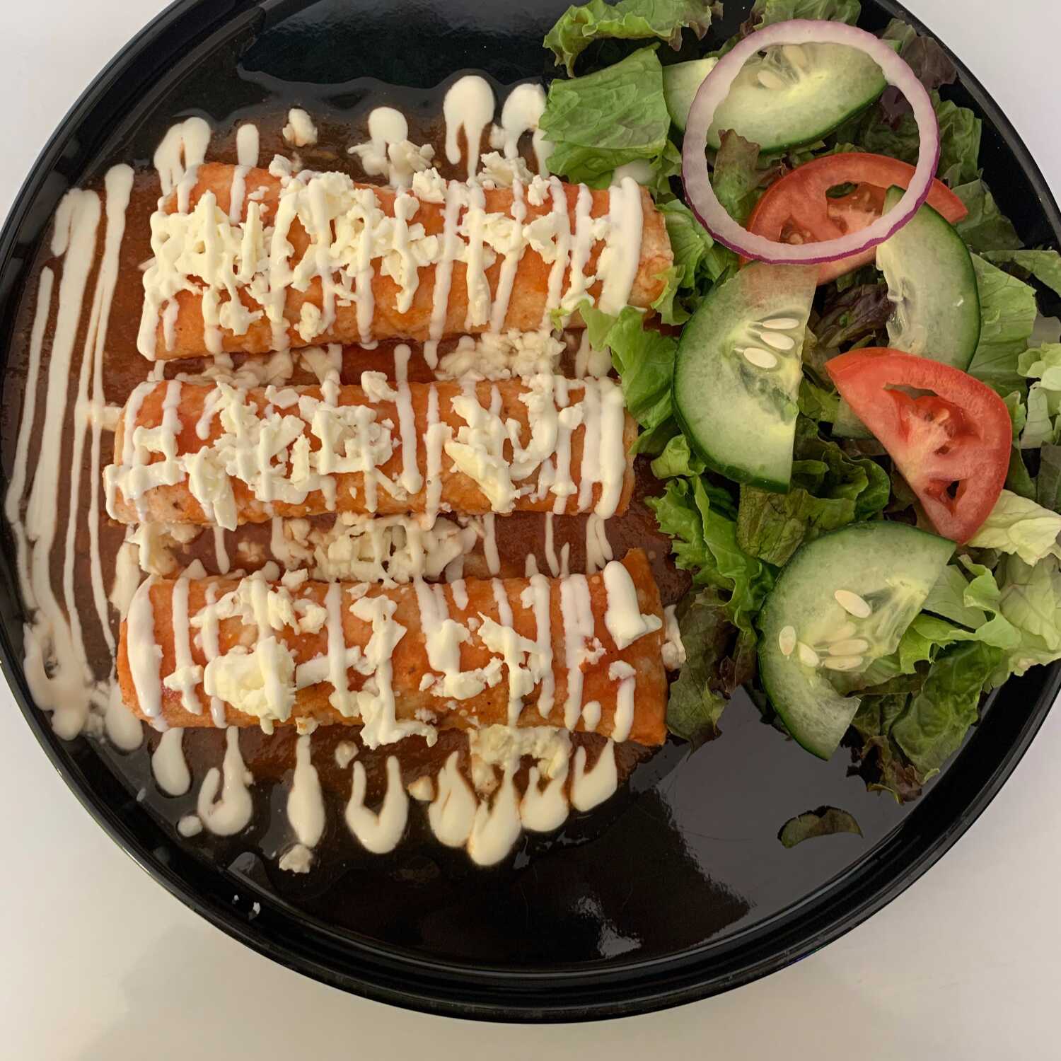 tres piezas de tortilla de maíz rellenas de pechuga de queso panela bañadas en nuestra salsa de tomate. acompañadas de ensalada fresca.
