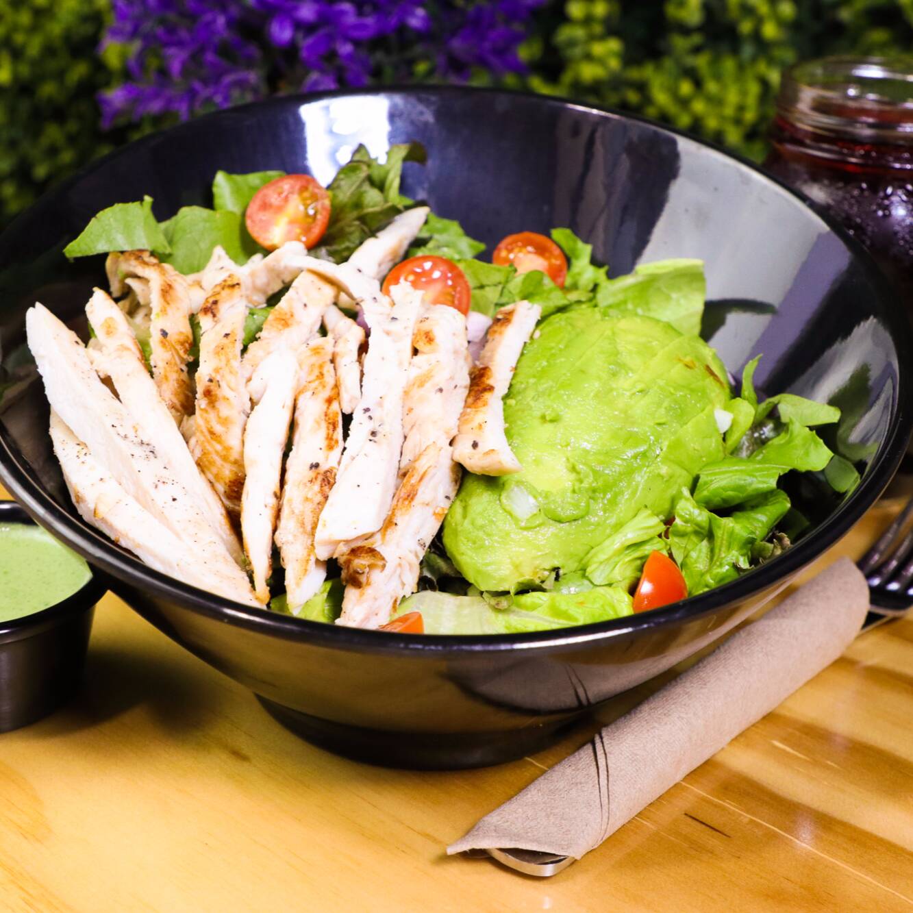 Mix de lechugas, aguacate, tomate cherry, cebolla morada, pechuga de pollo a la plancha y nuestro aderezo yogurt griego con cilantro de la casa.