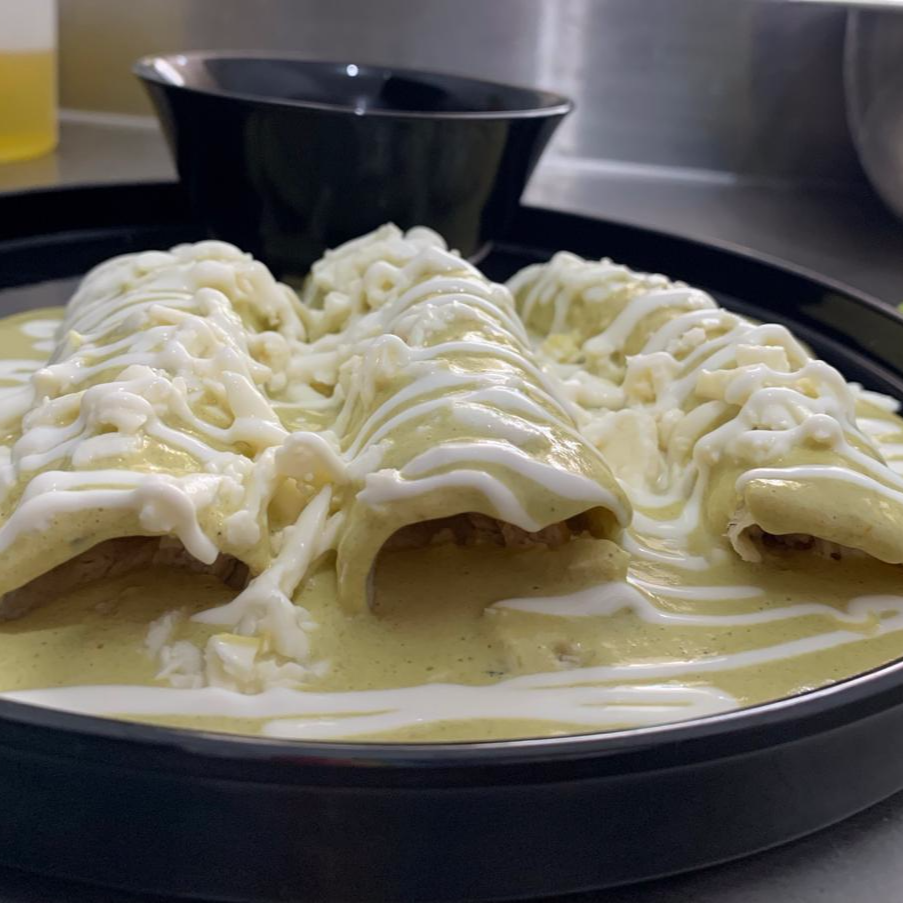Tres piezas de tortilla de maíz, rellenas de pechuga de pollo desherbado, bañadas en nuestra salsa poblana, panela, acompañadas de frijoles de la olla.