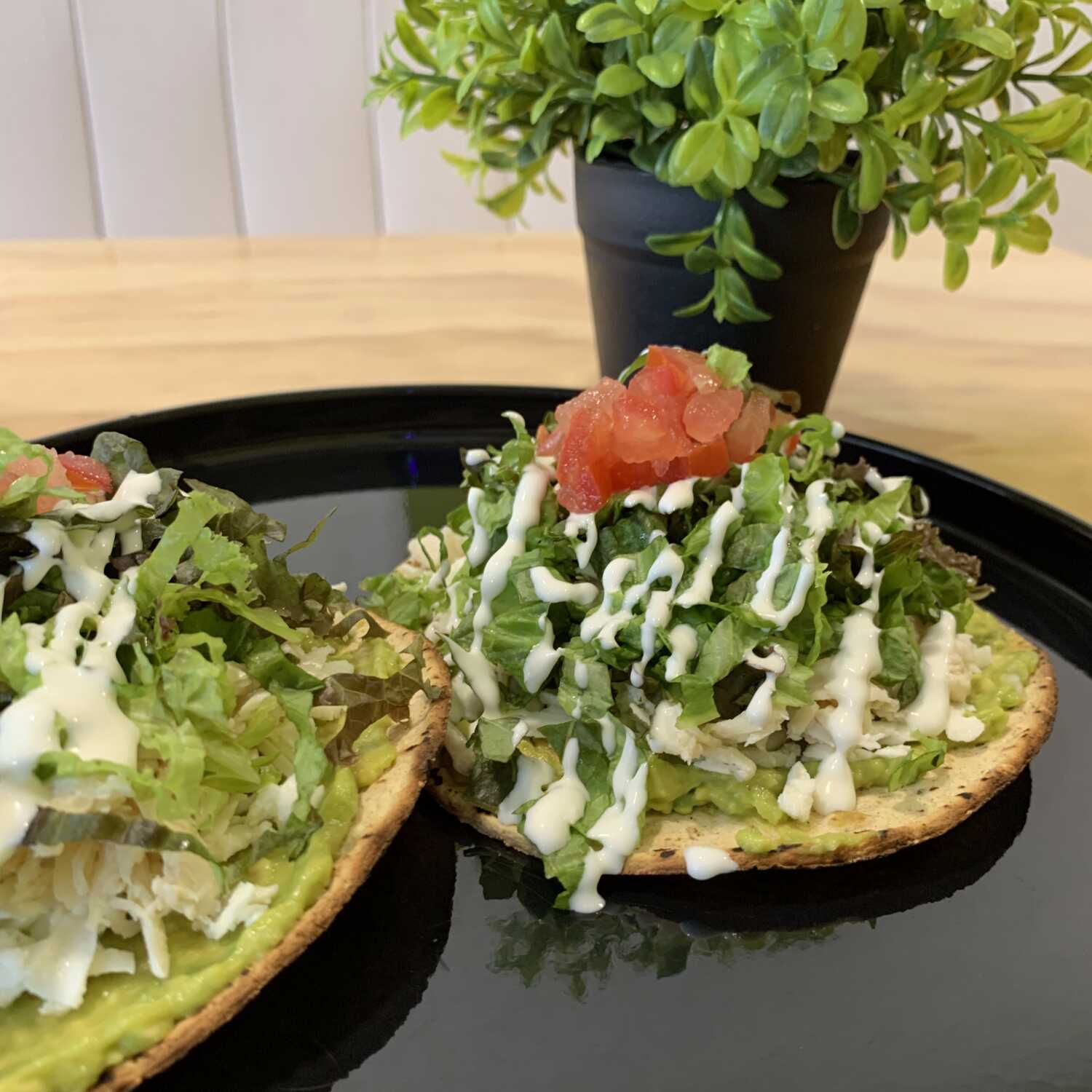 2 Piezas de tortilla deshidratada, aguacate, pollo deshebrado, crema baja en grasa, lechuga y tomate, acompañadas con salsa picante