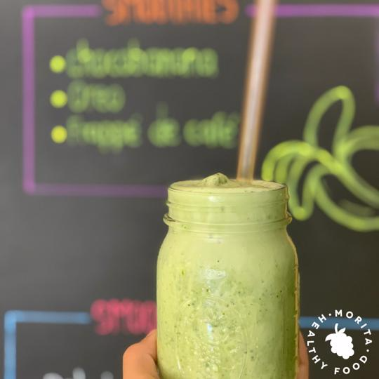 Matcha, plátano, espinaca, leche deslactosada, yogurt griego sin azúcar, endulzado con svetia.