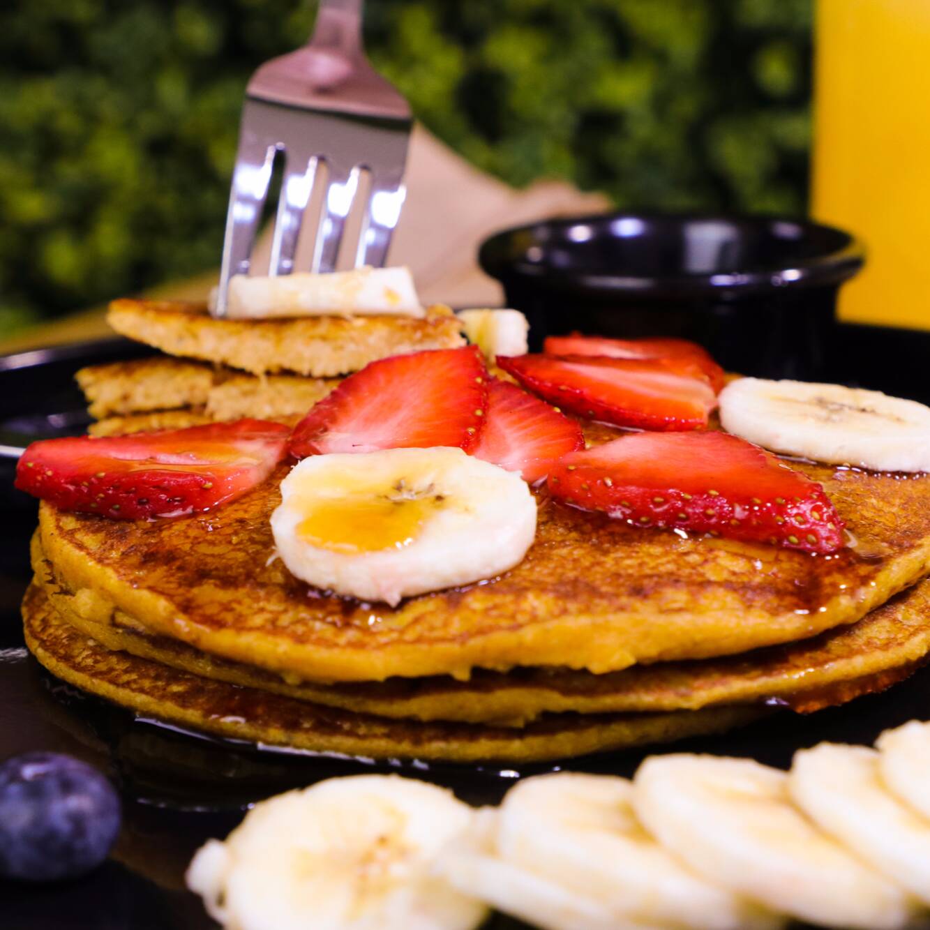 2 Pancakes de harina de avena con nuestro toque de la casa, canela, nuez, fruta de temporada y miel de maple o de miel de agave