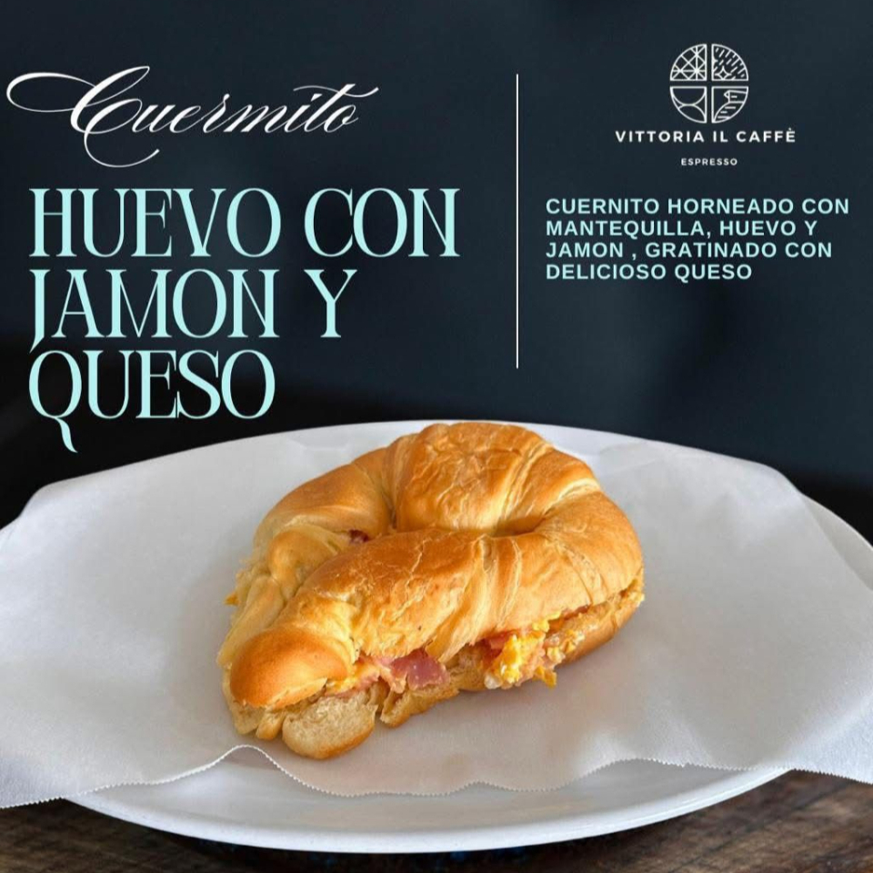 Cuernito calientito relleno de jamón de pavo, queso manchego y toque de hierbas finas.