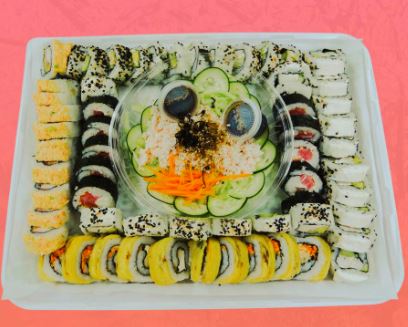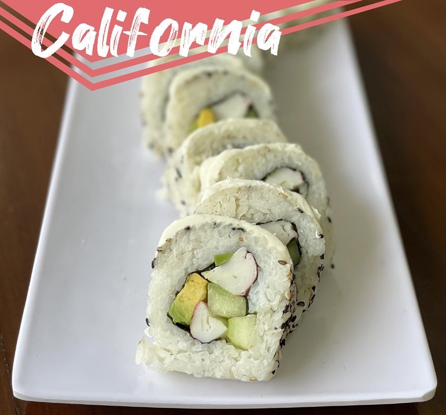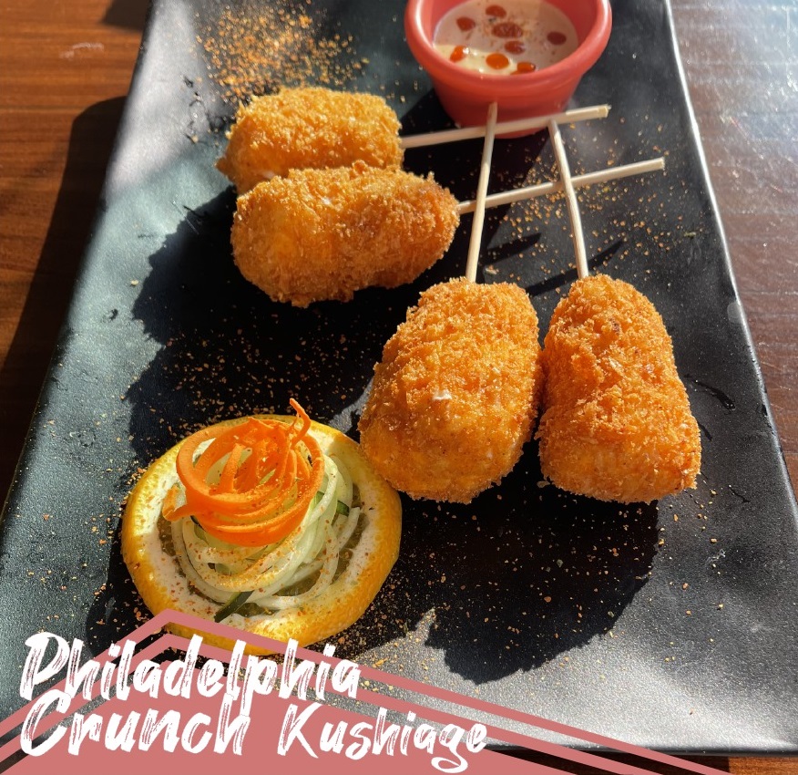 Bolita de arroz en forma triangular rellena de cangrejo y queso crema, acompañada de salsa chipotle o anguila, puede ser natural o empanizado en mix flaming hot.