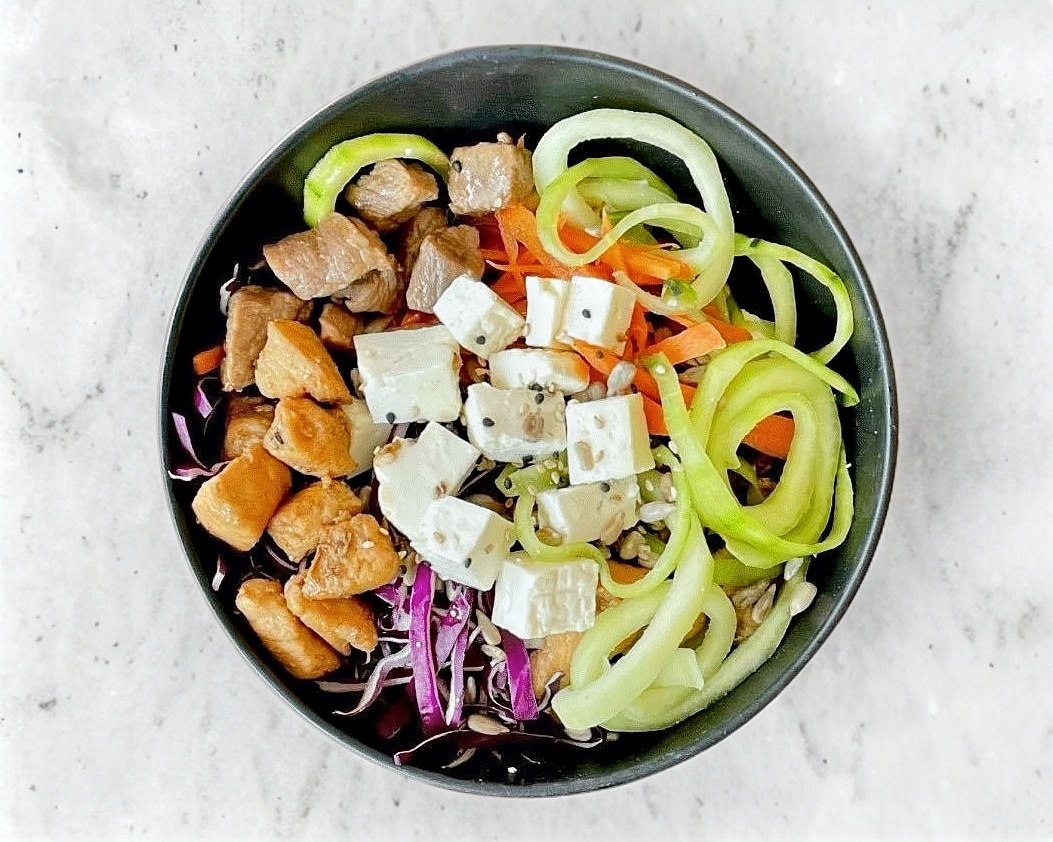Pollo salteado en salsa de soya y vino, servido con zanahoria, calabaza y chile morron finamente rayado, con un toque de chile de árbol y cacahuate.
