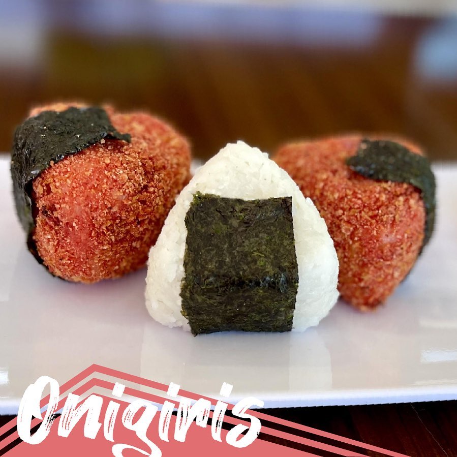 Bolita de arroz en forma triangular rellena de pollo en salsa de ajonjolí y acompañada de salsa de ajonjolí, puede ser natural o empanizado en mix flaming hot).