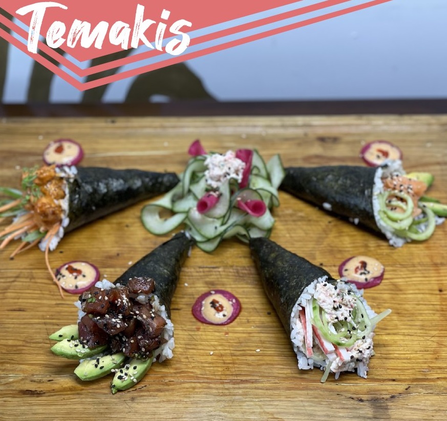 Cono de alga relleno de arroz gohan, camarones roca, queso crema, zanahoria y cebollín, bañado con salsa chipotle.