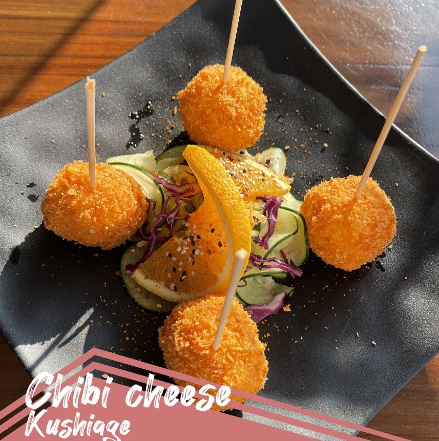 Bolita de arroz en forma triangular rellena de camarón y queso crema, acompañada de salsa chipotle o ánguila, puede ser natural o empanizado en mix flaming hot.