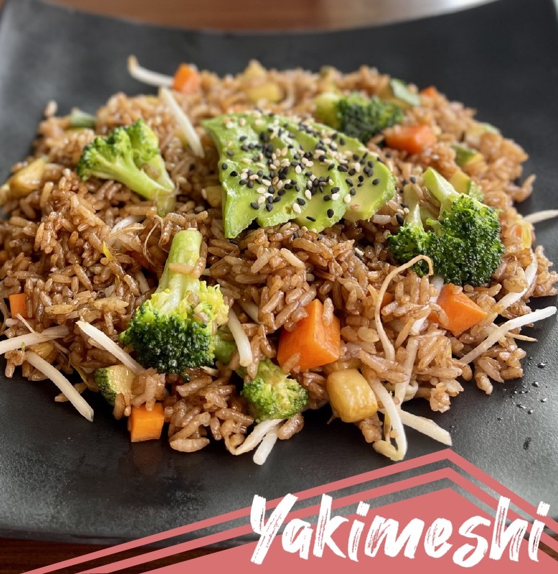 Arroz frito con mix de verduras y topping de pasta tampico.