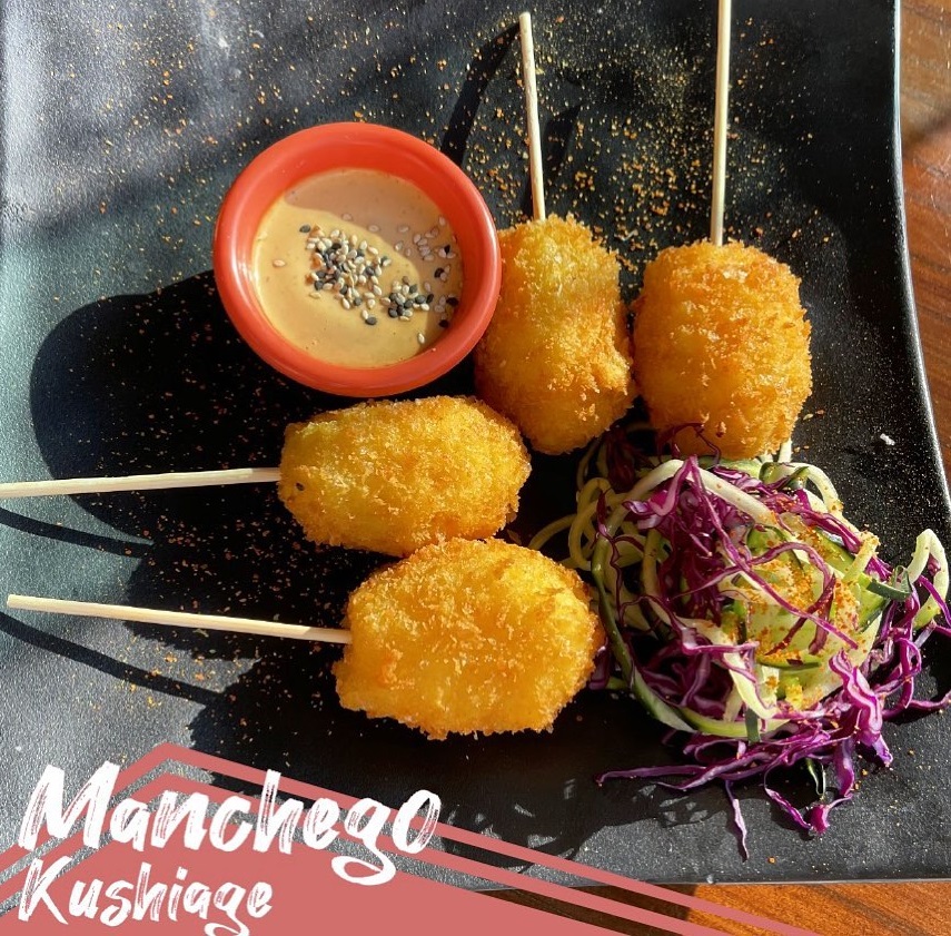 Bolitas de queso manchego empanizadas y acompañadas de salsa chipotle.