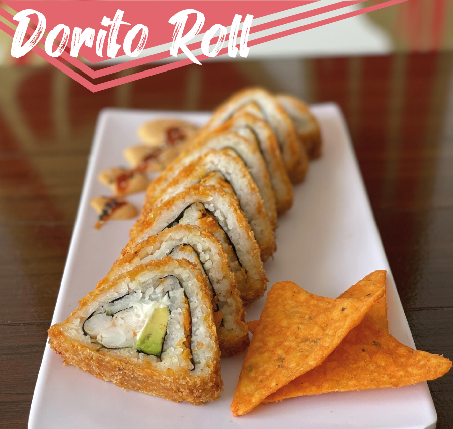 Por dentro: camarón, aguacate y queso crema, por fuera: empanizado con frituras de doritos, (empanizado).