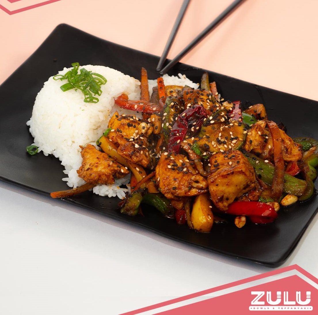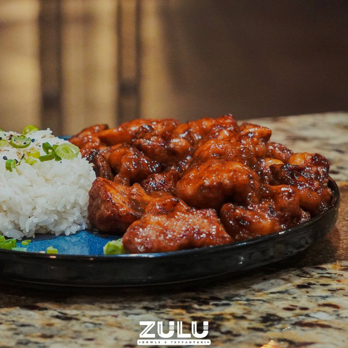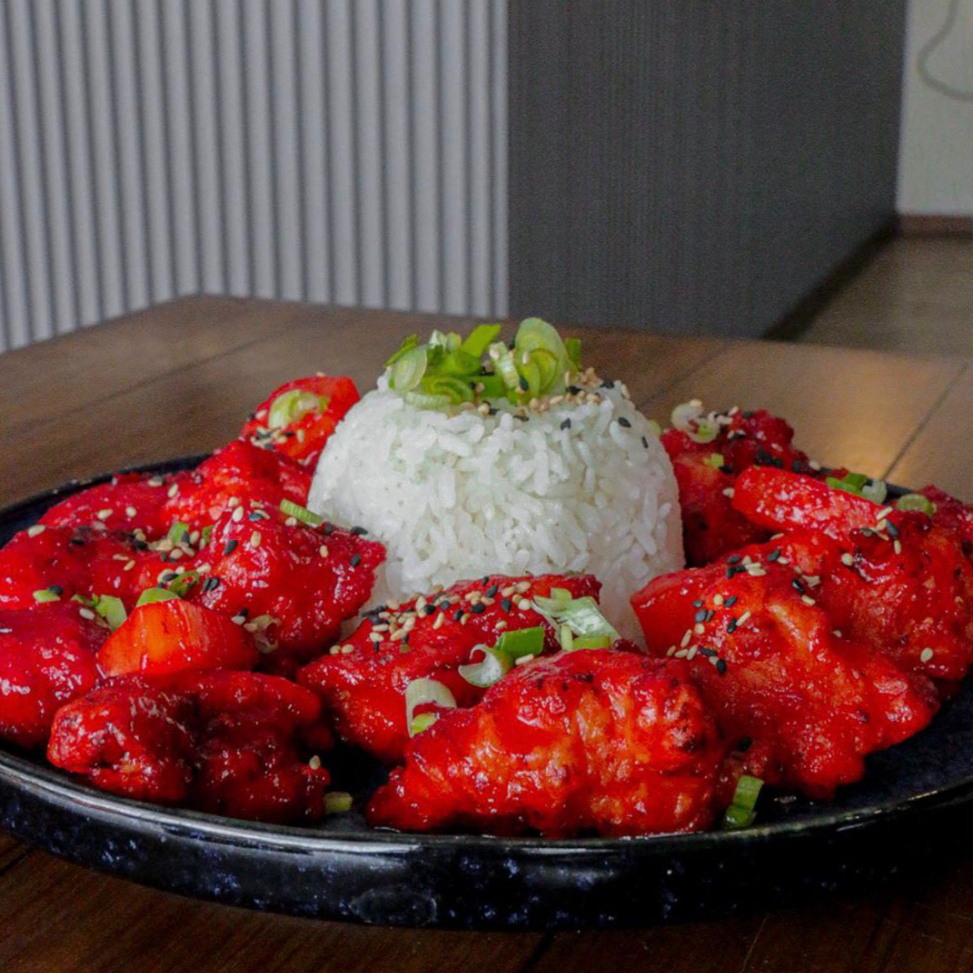 Pollo capeado y bañado en salsa agridulce, servido sobre una cama de arroz gohan, con ajonjolí negro y cebollín encima.
