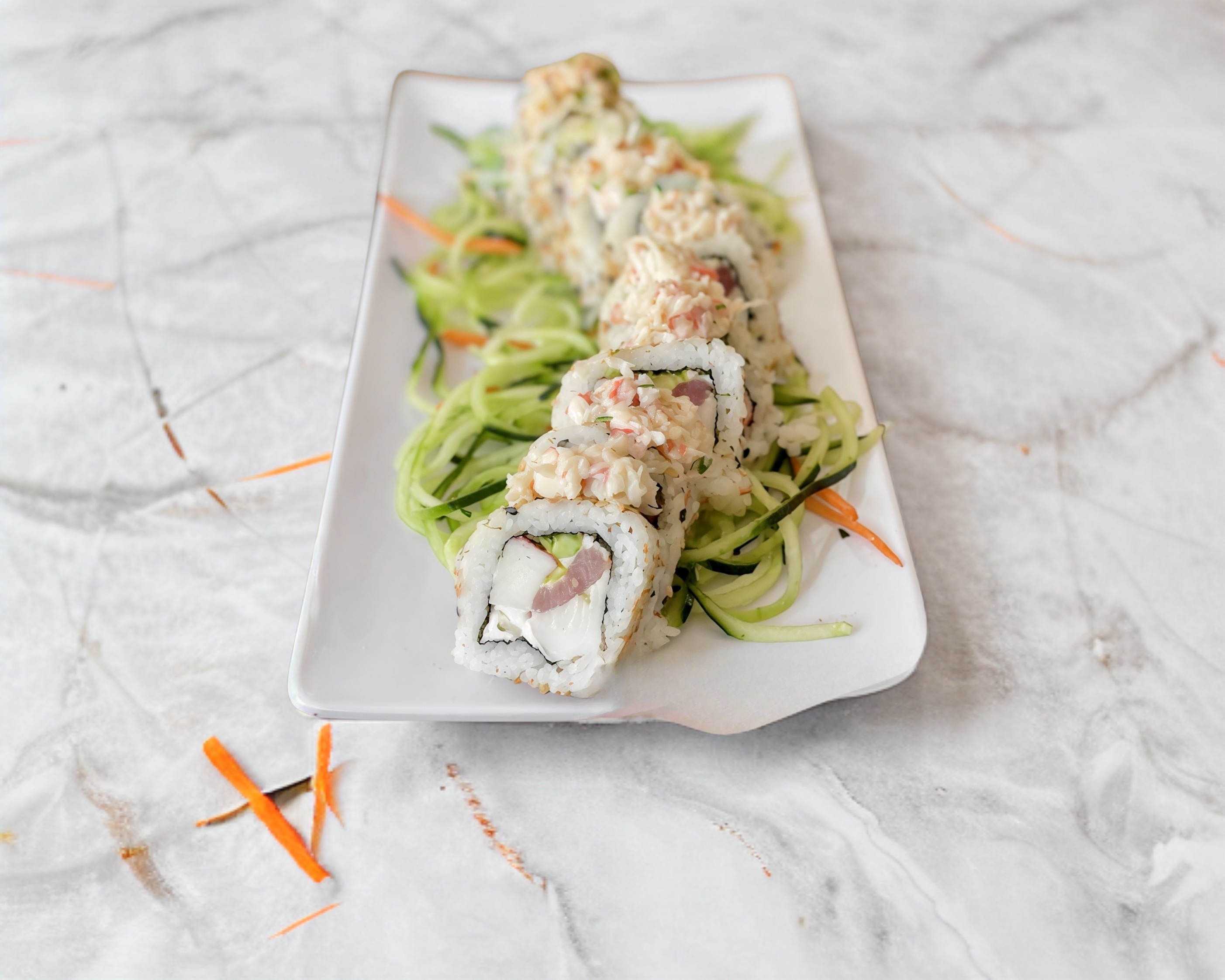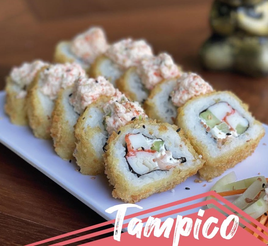 Camarón, cangrejo, queso crema, furikake y pepino todo envuelto empanizado y con topping de tampico encima.