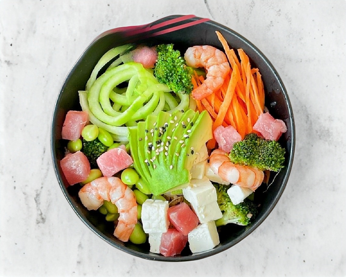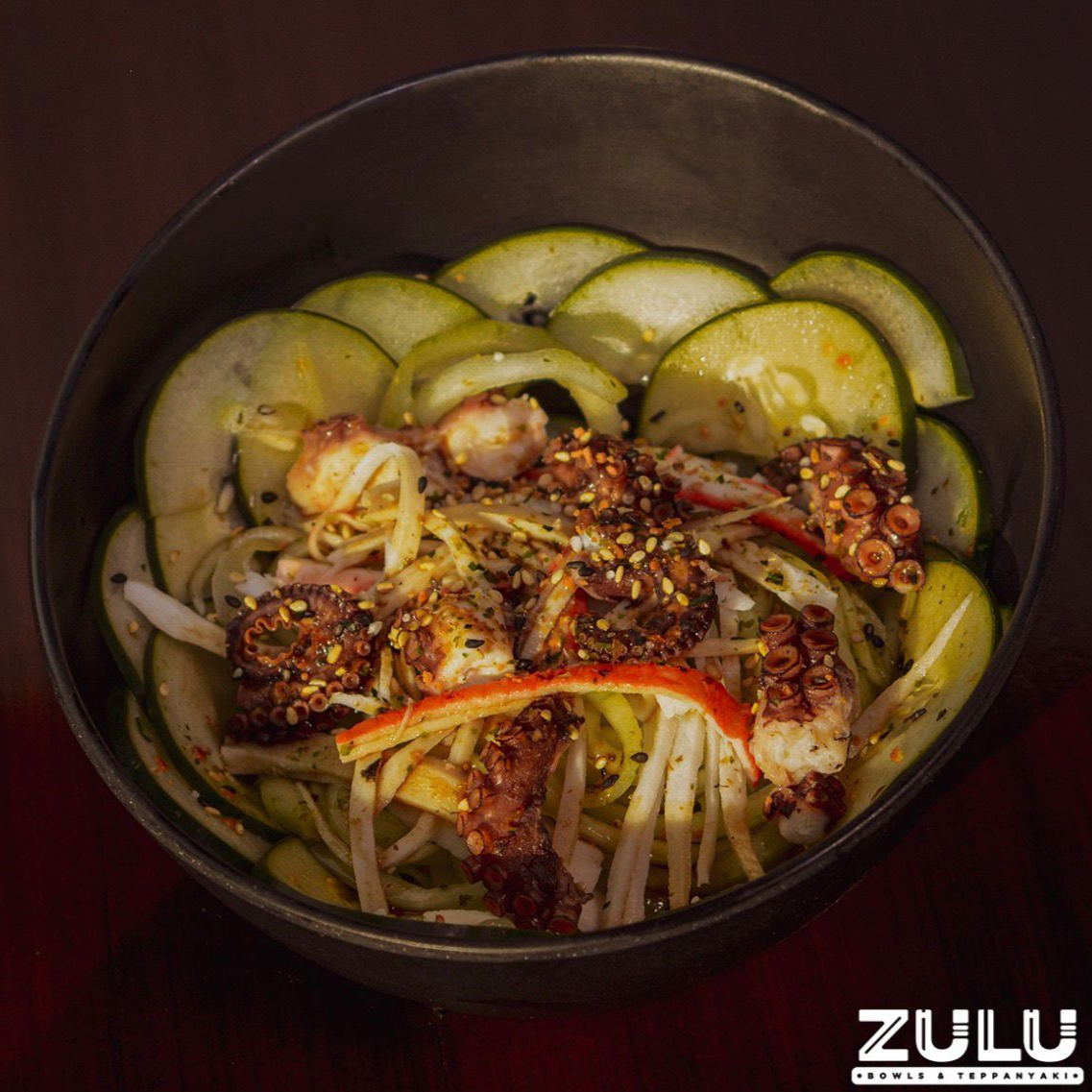 Fideos de pepino bañados en vinagre de manzana y soya, acompañada de cangrejo, pulpo y semillas de ajonjolí mixtas.