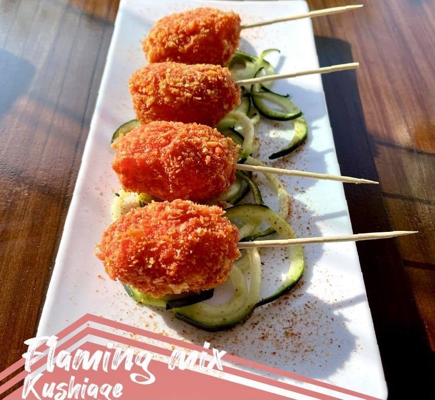 Bolitas de queso manchego y Philadelphia empanizadas en mix de takis, Doritos y Cheetos Flaming Hot, acompañadas de salsa chipotle.