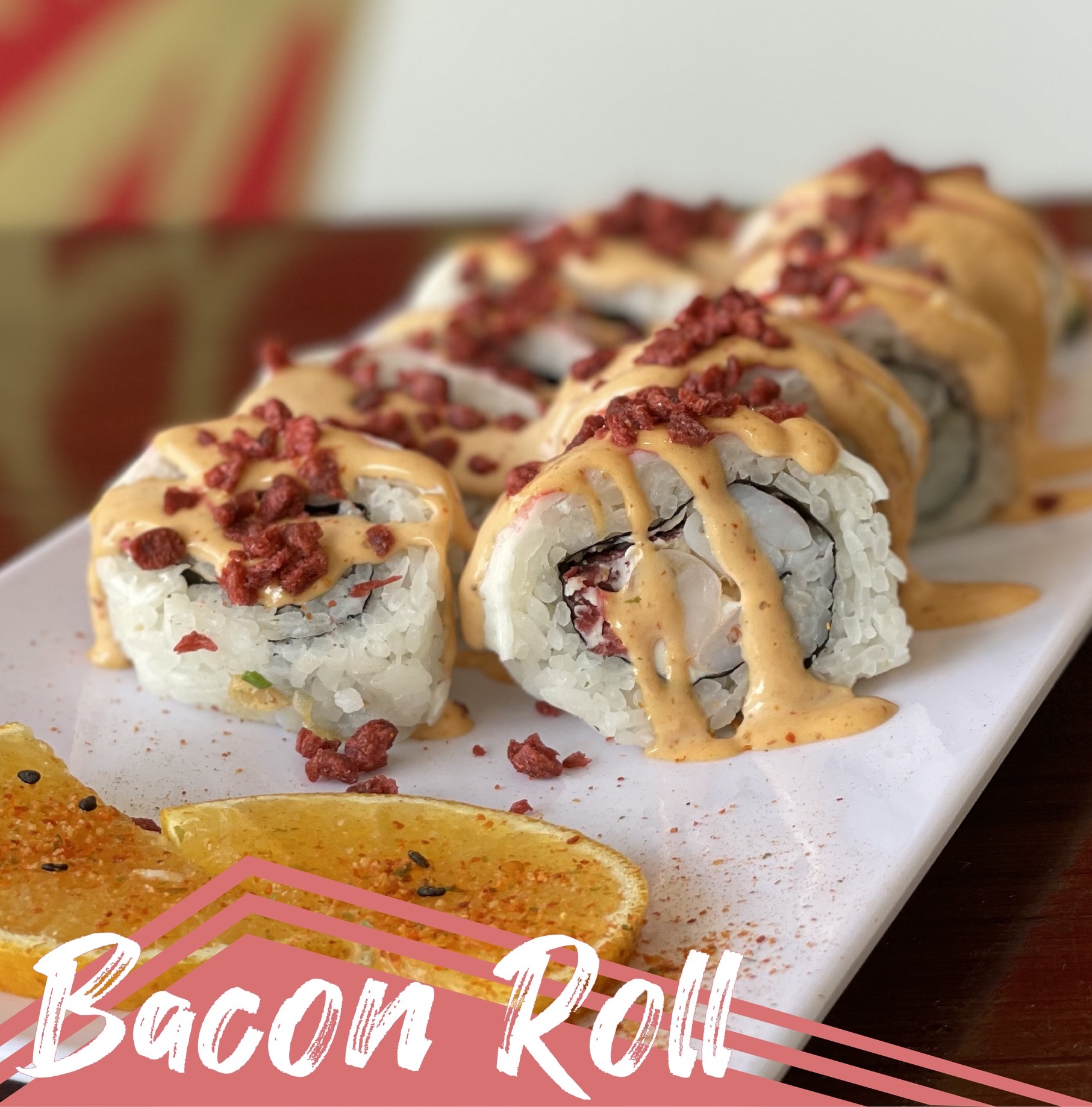 Por dentro, camarón, queso crema y trocitos de tocino, por fuera: Cangrejo, chipotle y trocitos de tocino, frio.