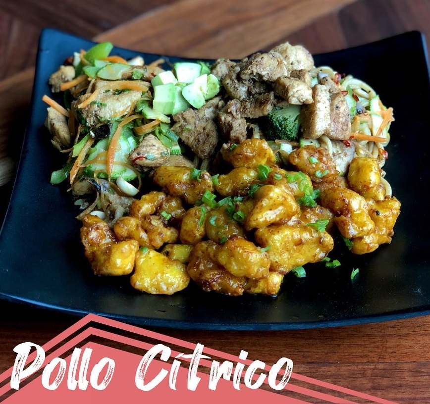 Pollo capeado y bañado en salsa cítrica, servido sobre una cama de arroz gohan, con ajonjolí blanco y cebollín encima.