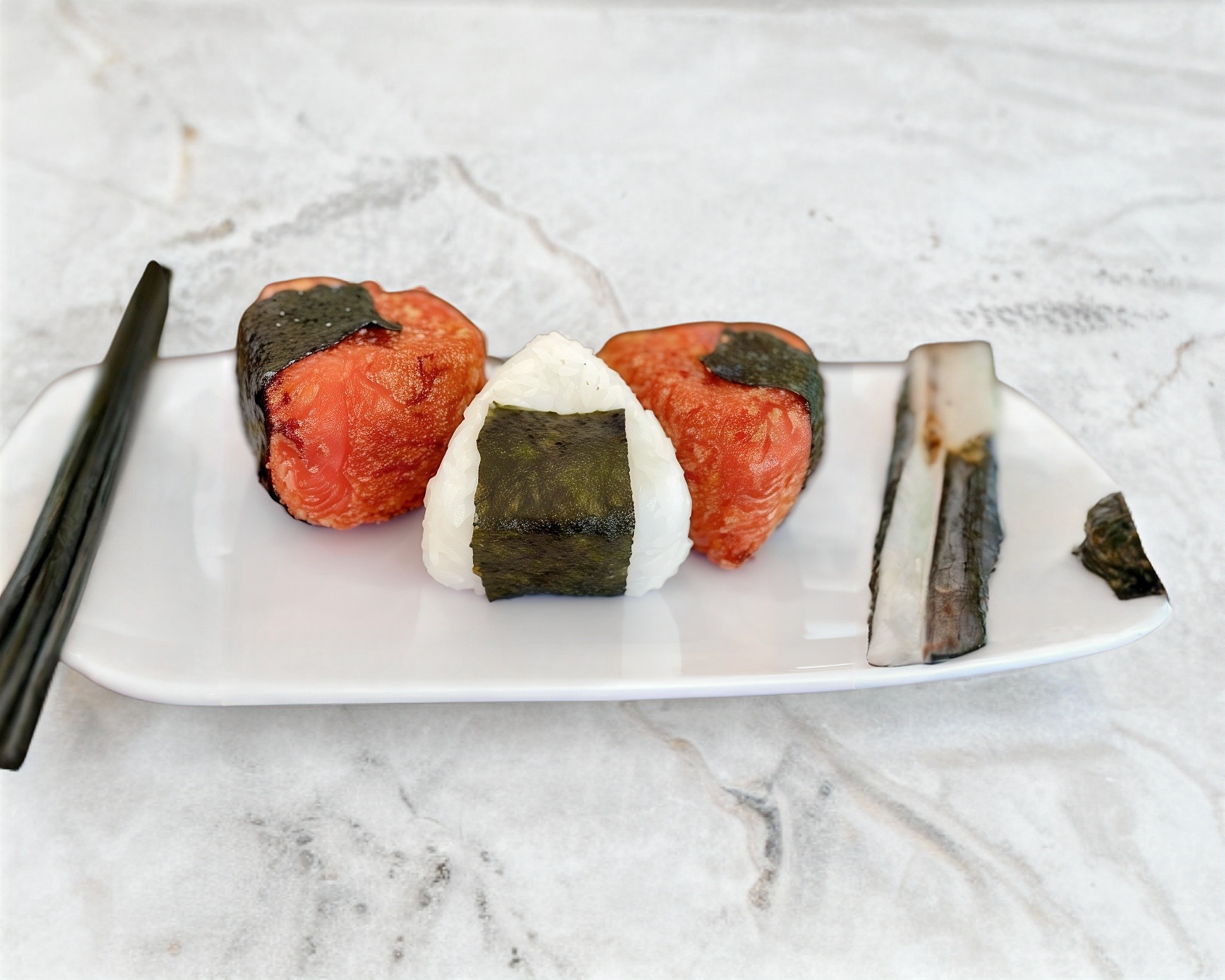 Bolita de arroz en forma triangular rellena de cerdo agridulce y acompañada de salsa agridulce.