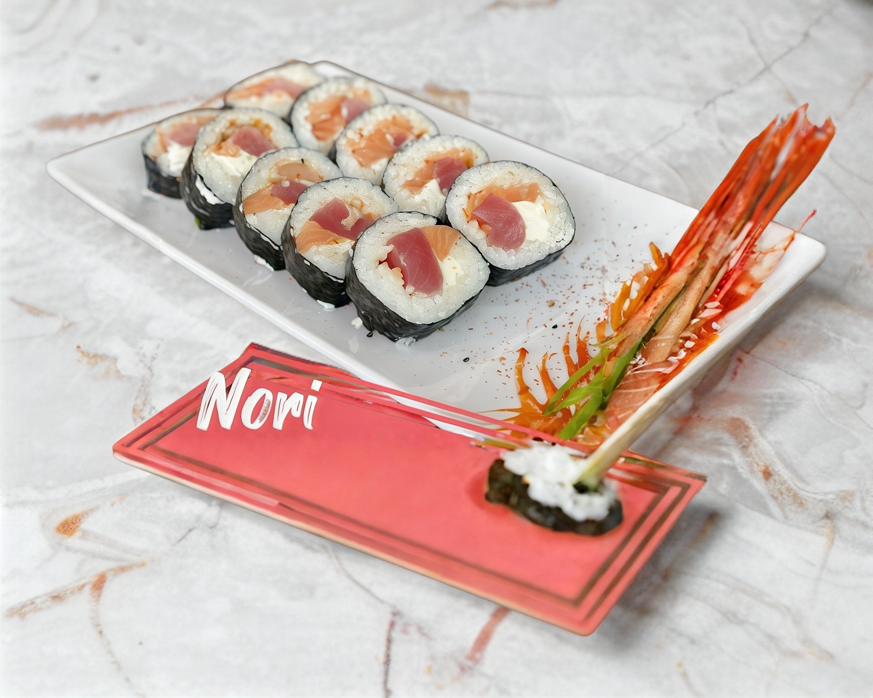 Atún, salmón, queso crema y togarashi con alga por fuera.