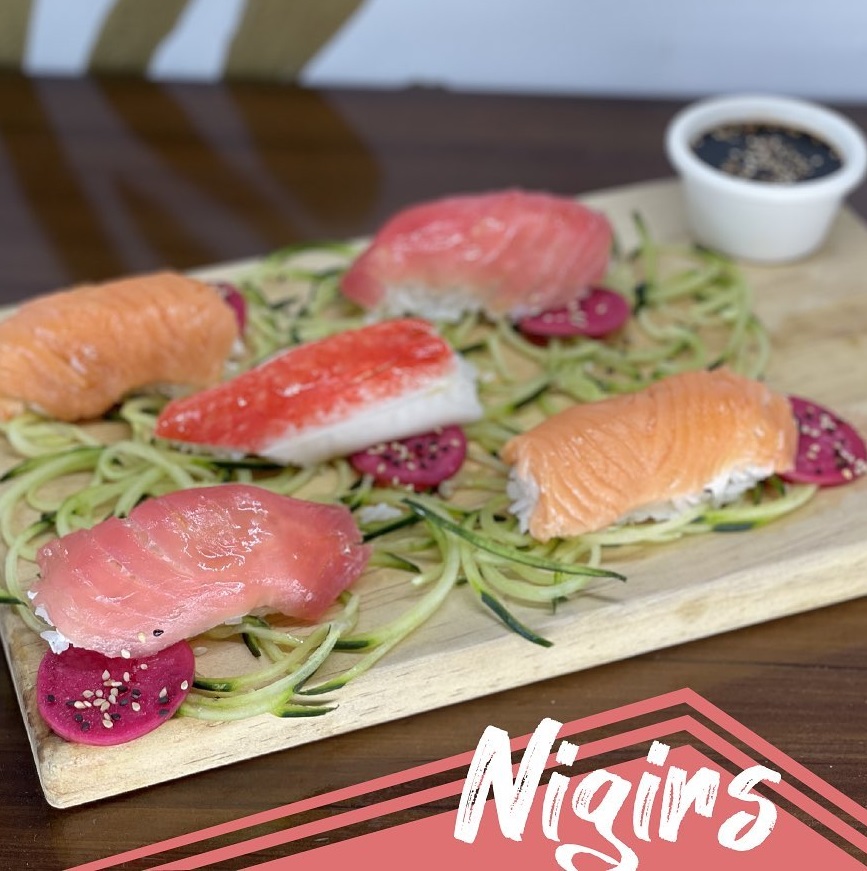 Nigiri de salmón acompañado de salsa ponzu o soya.