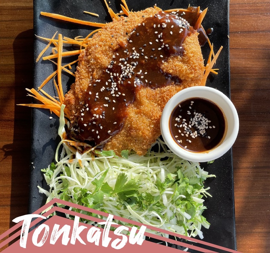 Filete de cerdo empanizado y frito, servido con ensalada de repollo y salsa tonkatsu.