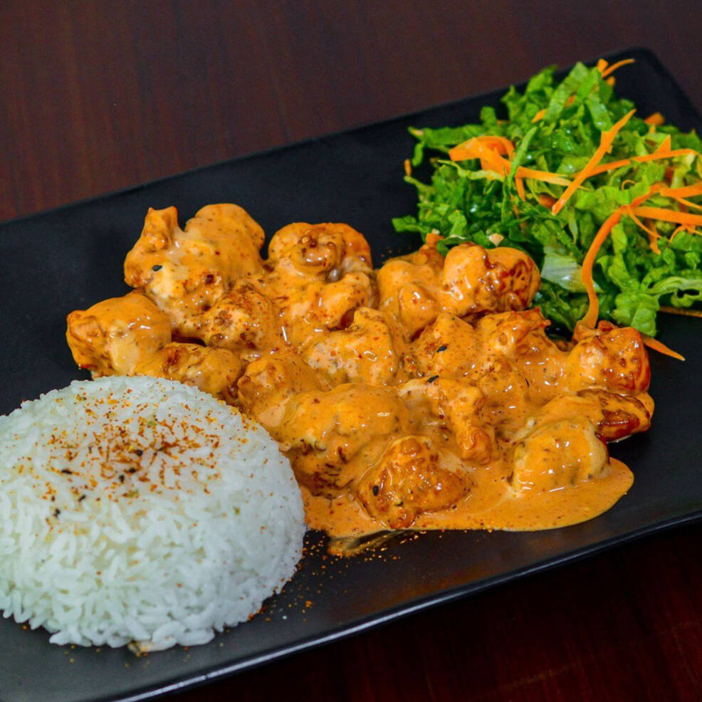 Camarón capeado y bañado en salsa chipotle con sriracha, servidos sobre una cama de arroz gohan o mix de lechuga.