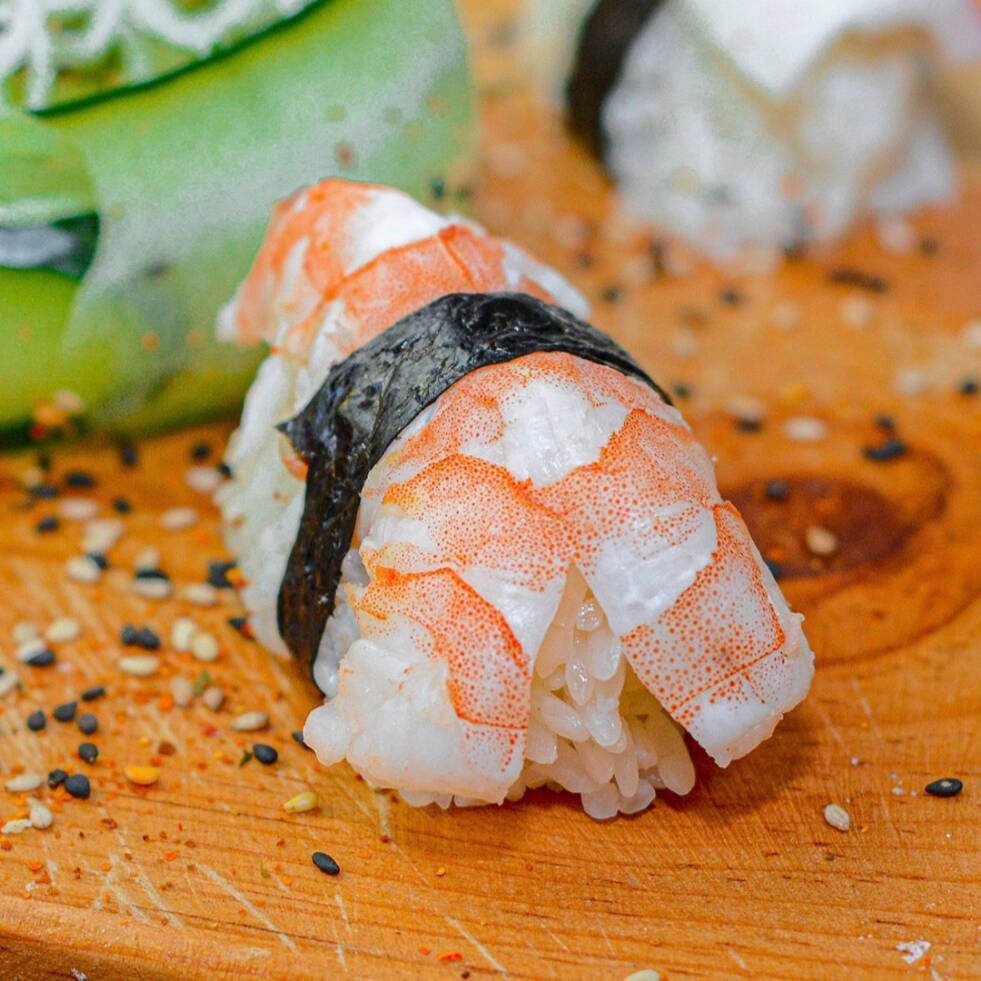 Nigiri de camarón acompañado de salsa ponzu o soya.