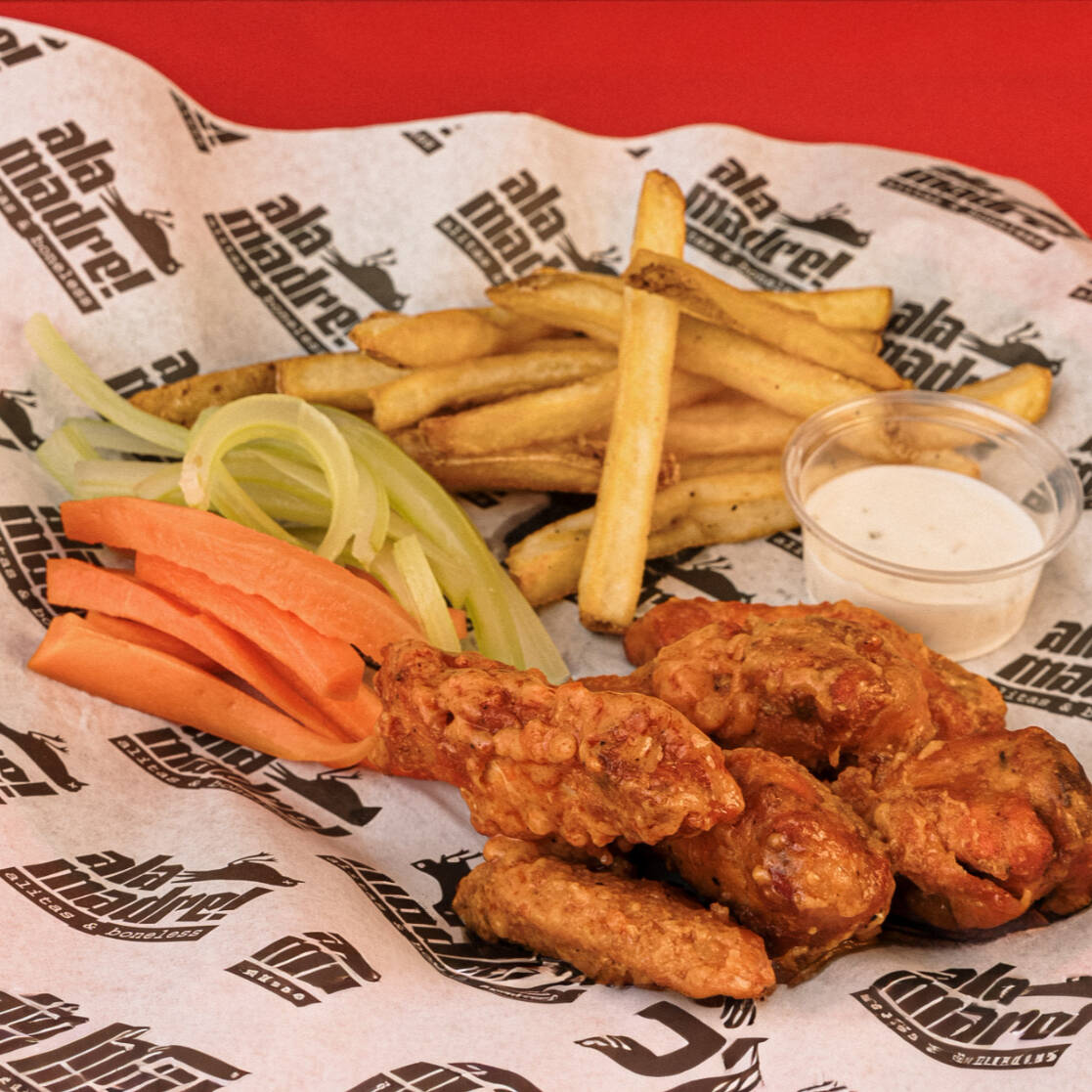 Alitas bañadas en la salsa de tu preferencia más papas y una bebida de 600ml. (max. 1 salsa)
