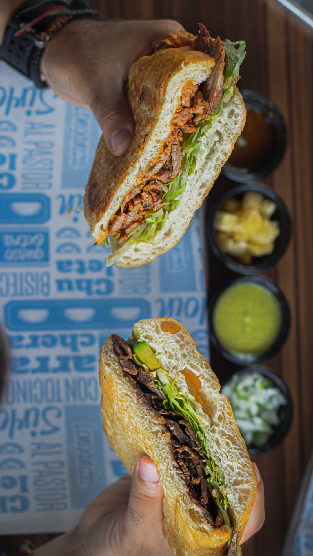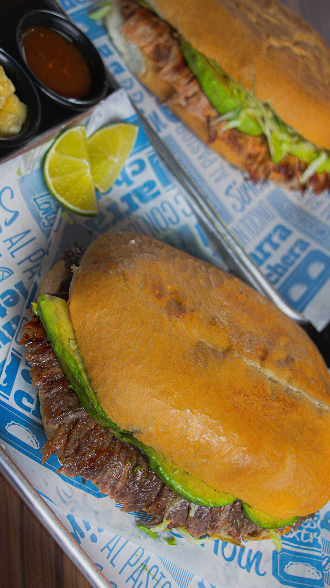 Enorme pan de telera doble rellena con carne al gusto, lechuga, catsup, mayonesa..