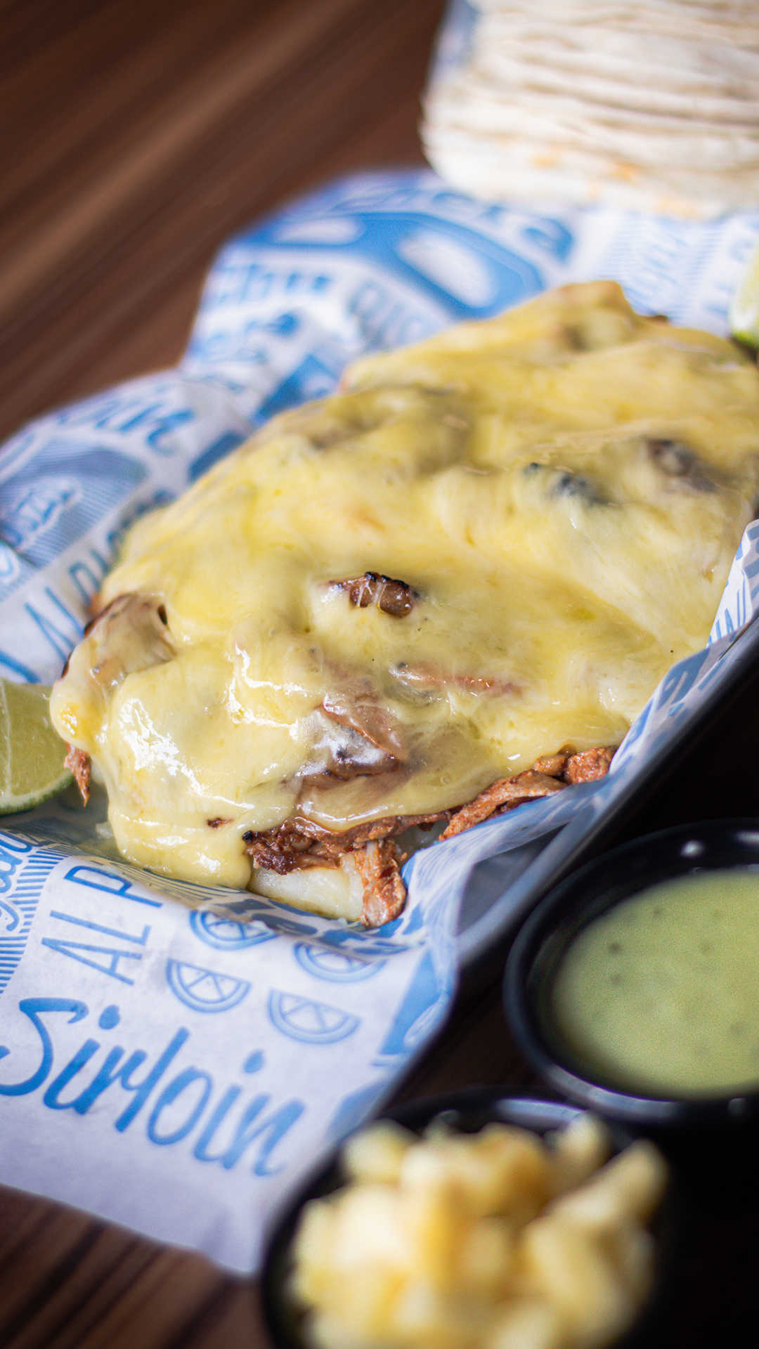 Deliciosa carne de tu elección con queso gouda derretido y tortilla de harina