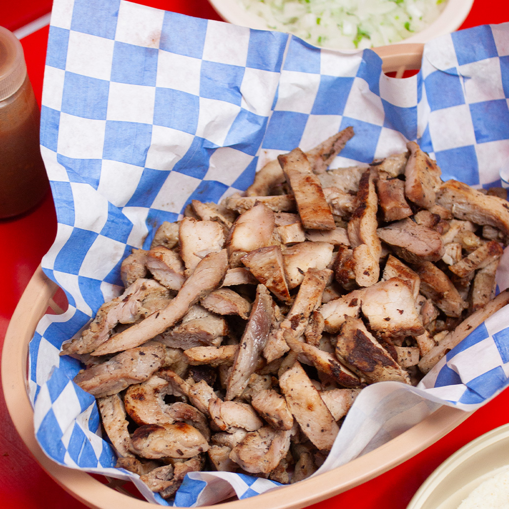 Taco de Asada de cerdo en tortilla de maiz, cebolla salsa y limon