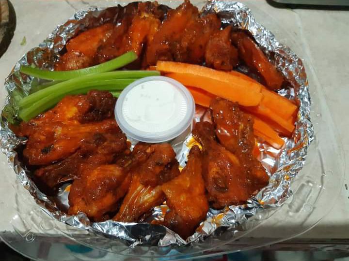 1 kg y medio (28-30 pzas) jugosas y deliciosas alitas bañadas en la salsa de su eleccion, producto 100% frescos, acompañadas de aderezo ranch