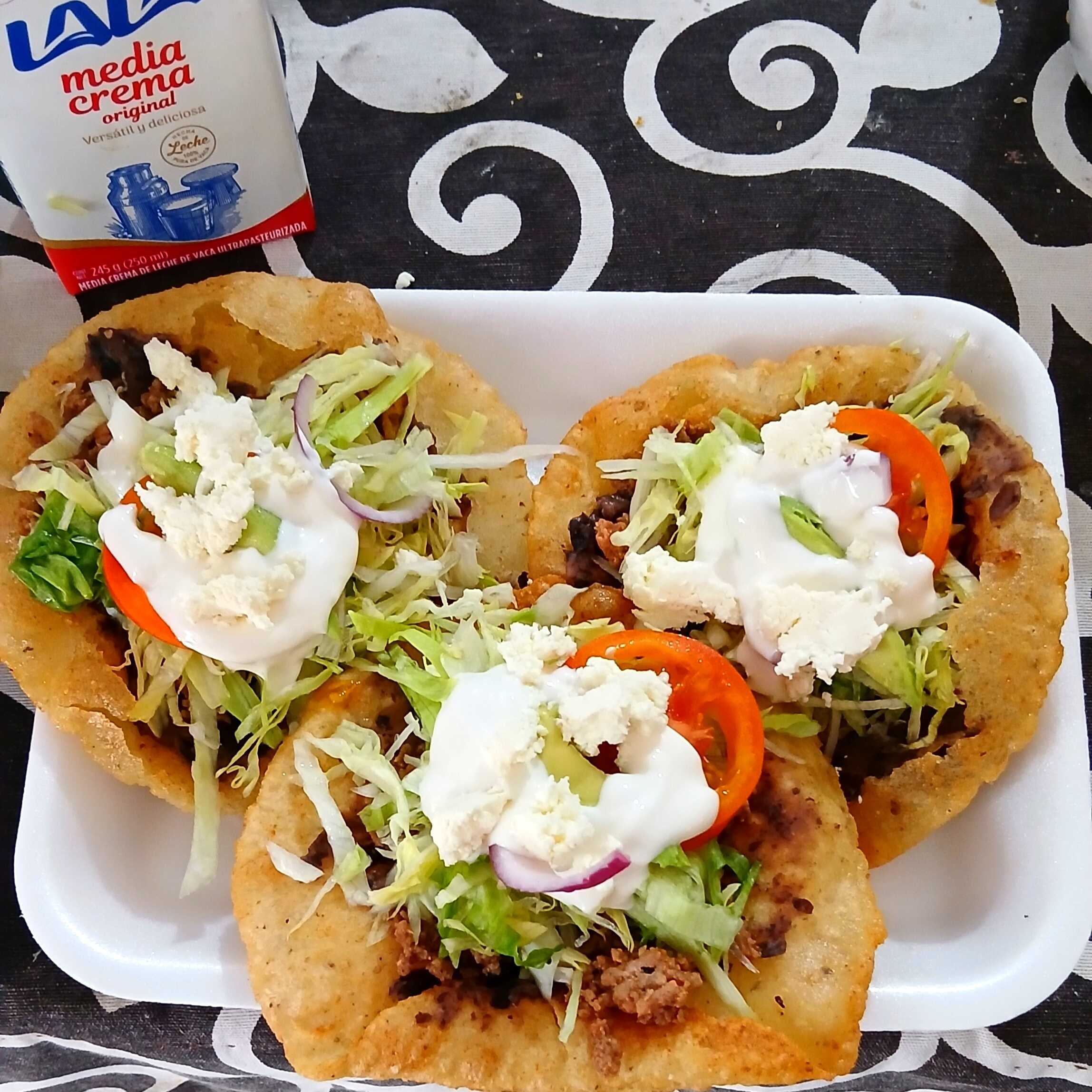Carne molida de res, tomate, cebolla, lechuga, frijol, queso doble crema, media crema, aguacate
