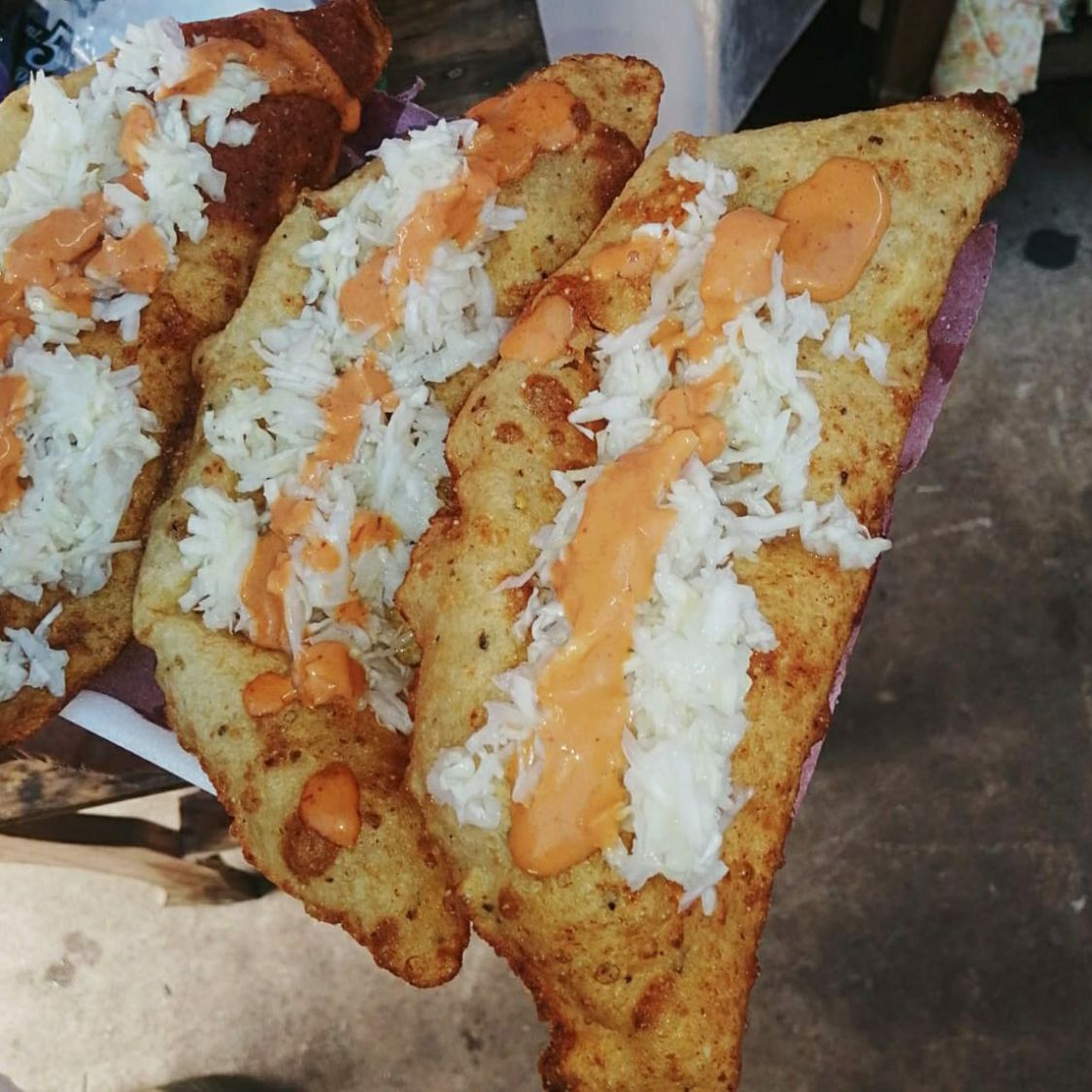 Empanada de queso crema con azúcar acompañada de salsa y repollo aparte