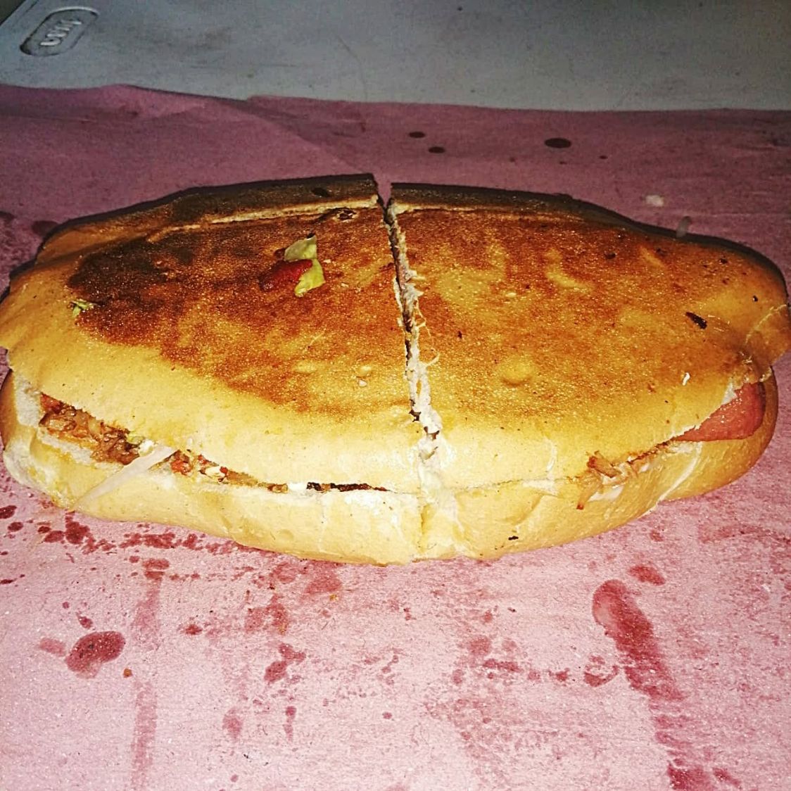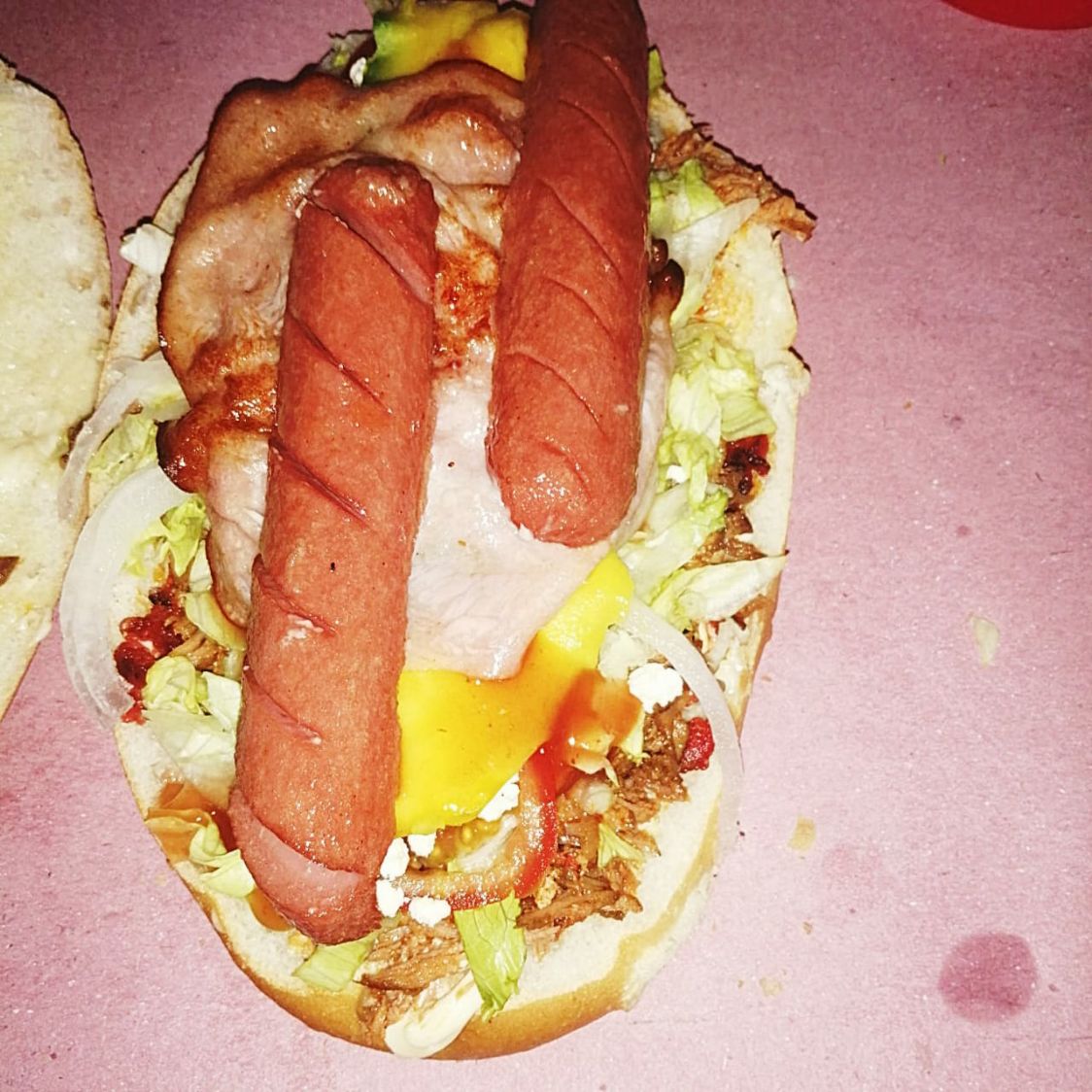 Torta cubana de pierna con frijol, mayonesa, salchicha, jamon, chorizo aguacate, cebolla, queso doble crema y queso de hebra, acompañada de salsas