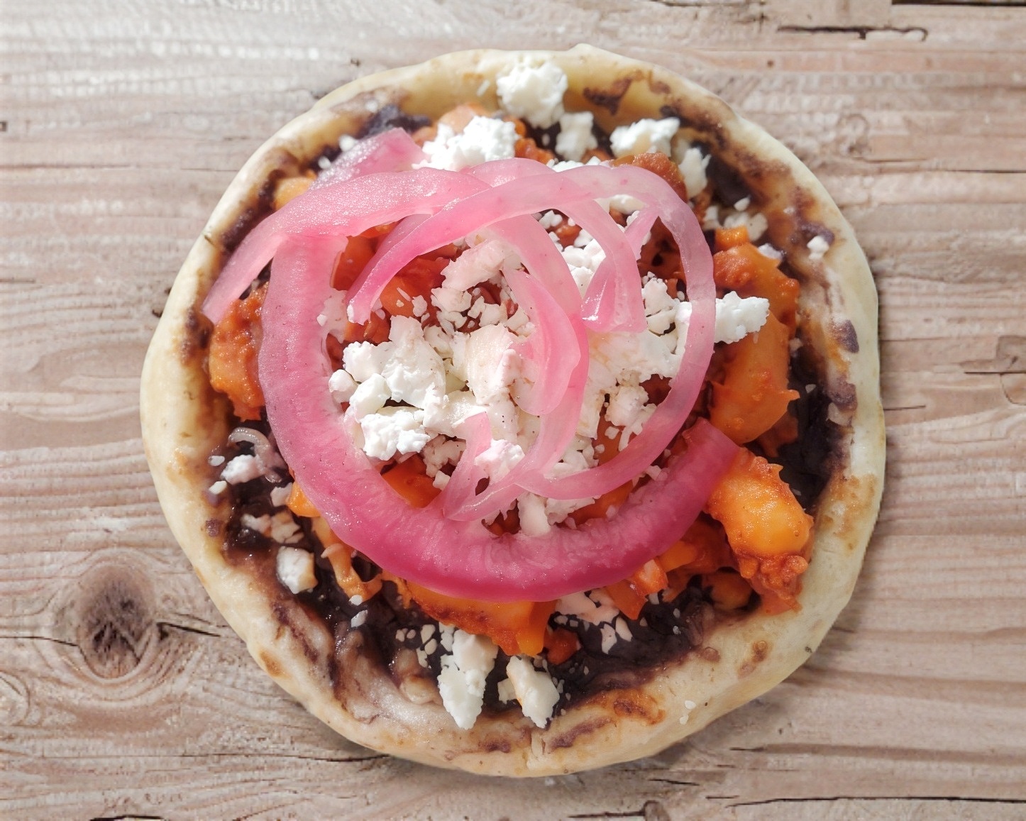 Tortilla de maiz nixtamalizado, base de frijolito, queso doble crema y cebollita curtida. Incluye salsa aparte.
