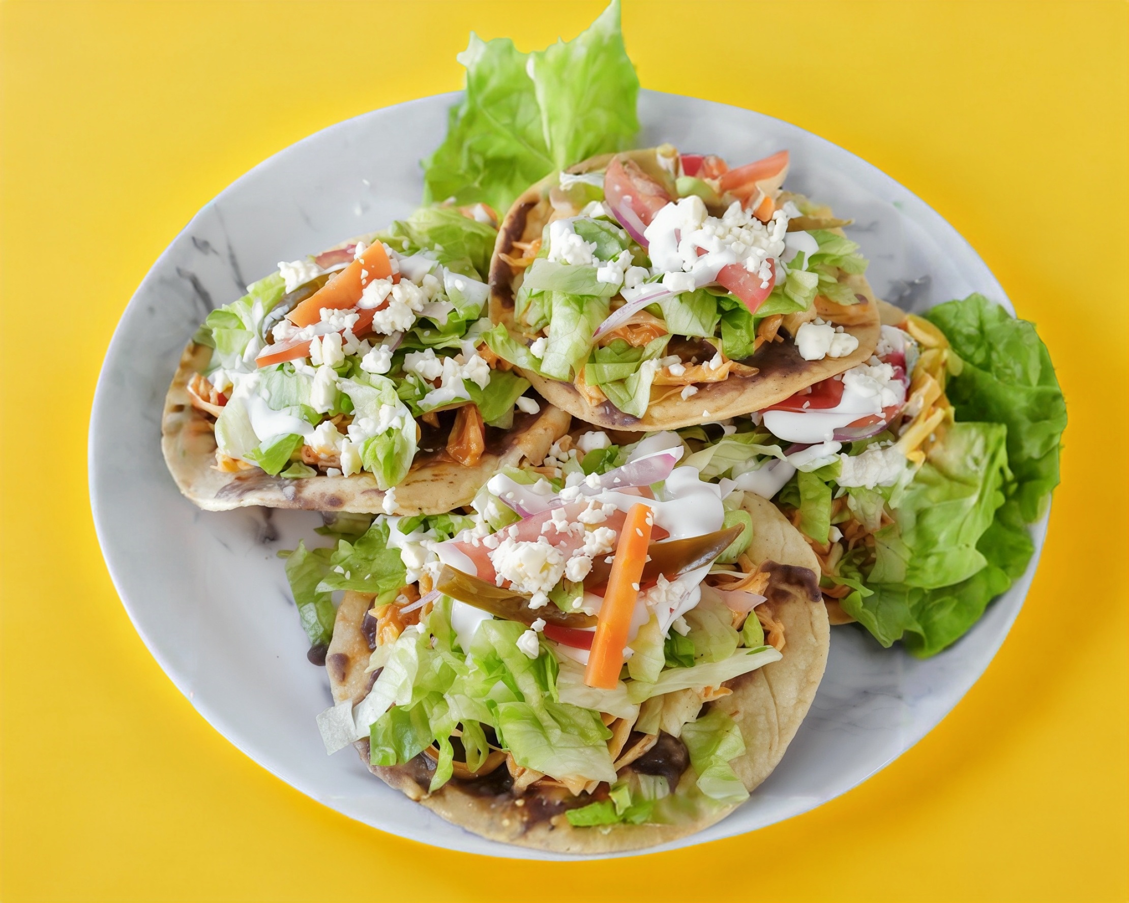 5 flautas de pollo guisado con lechuha, tomate, cebolla.